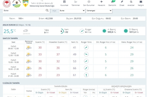 Meteoroloji Genel Müdürlüğü’nden alınan verilere göre, bugün Bursa parçalı bulutlu sıcaklığın ise en yüksek 33, en düşük 16 derece olması bekleniyor. Yarından itibaren çarşamba gününe kadar sıcaklıklar 11 derece azalarak 22 dereceye düşeceği tahmin ediliyor.
