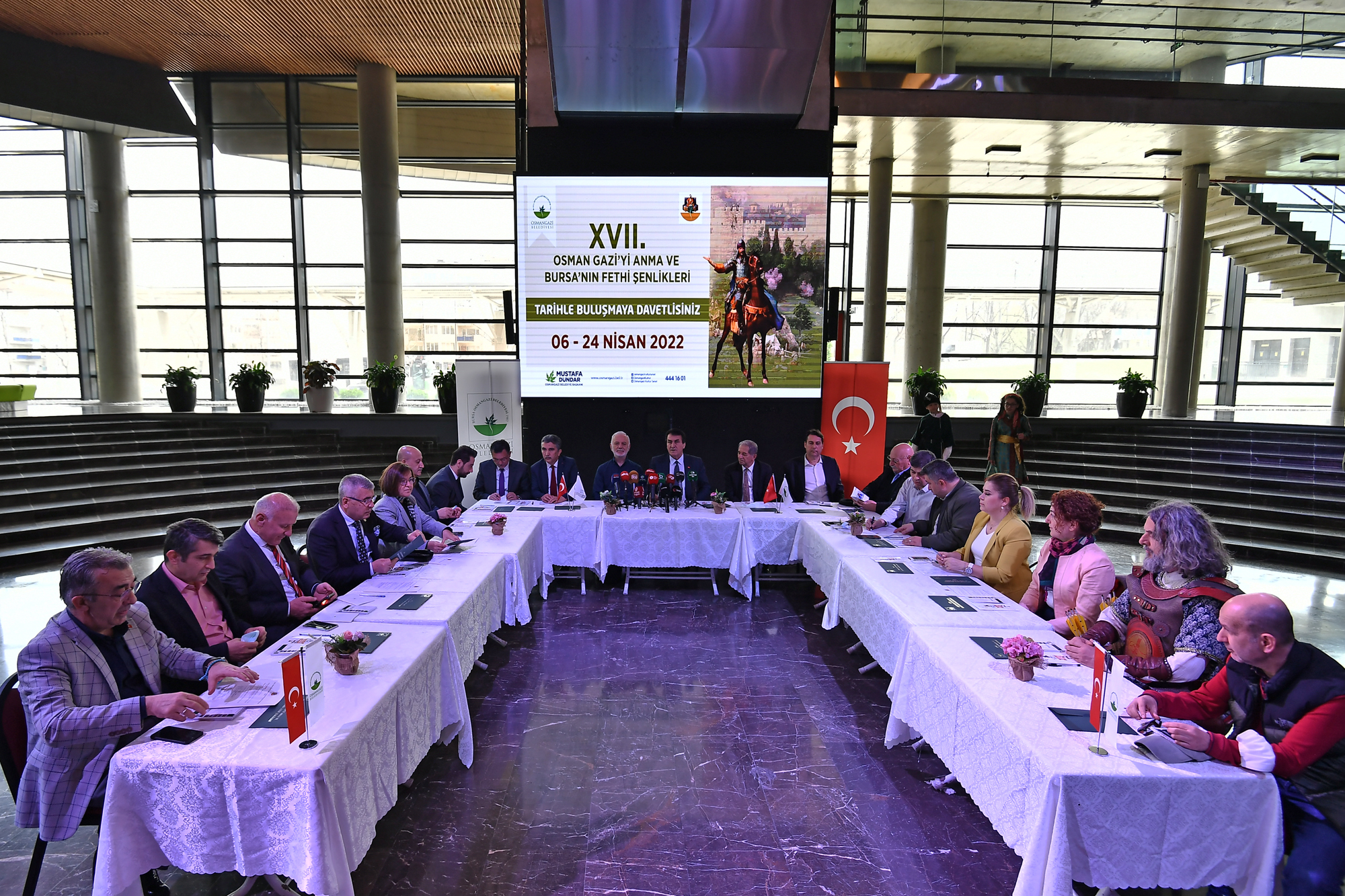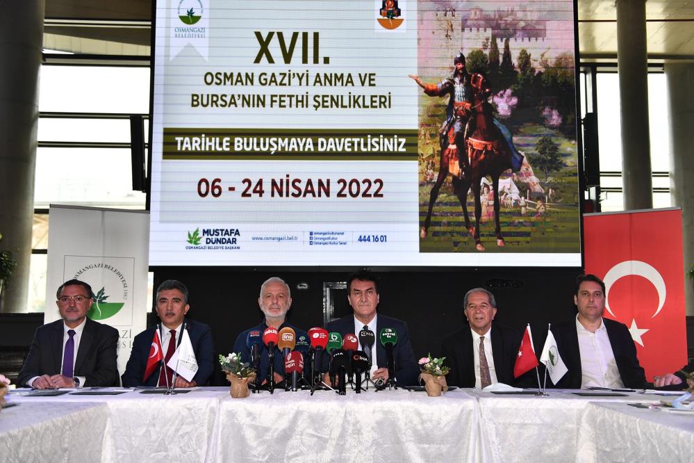 Osmangazi Belediye Başkanı Mustafa Dündar, Panorama 1326 Bursa Fetih Müzesi’nde düzenlenen basın toplantısında bu yıl 17.’si gerçekleştirilecek olan Osman Gazi’yi Anma ve Bursa’nın Fethi Şenlikleri’nin etkinlik takvimini açıkladı. Bu yıl salgının etkisinin azalması ve kısıtlamaların kalkmasıyla birlikte Bursa’nın fethinin 696’ıncı yıldönümü için coşku dolu bir şenlik programı hazırladıklarının altını çizen Başkan Dündar, “17 yıldır gerçekleştirdiğimiz Osman Gazi’yi Anma ve Bursa’nın Fetih Şenlikleri, ciddi bir altyapıya sahip, kurumsallaşmış ve her kesime hitap eden etkinlikler bütünlüğünden oluşmaktadır. Bu etkinlikler ile birlikte Bursa’nın fethinin kutlandığı bayram havasında bir Nisan ayı geçireceğiz. Bursa, 23 yıllık kuşatmanın sonucunda savaş olmadan ve kan dökülmeden fethediliyor. Osmangazi Belediyesi olarak, Bursa’nın fethini baharı müjdeleyen Nisan ayında, sevgi, barış ve kardeşlik ortamında 17 yıl önce kutlamaya başladık ve bunu sürdürüyoruz” dedi.