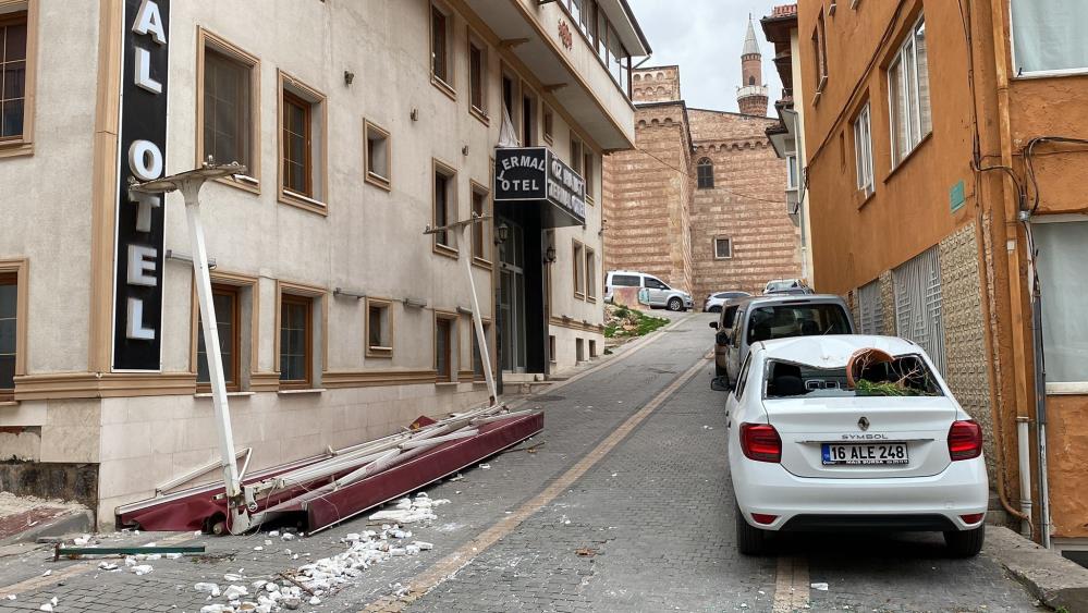 Çekirge mahallesinde bir çay bahçesinin demir tentesi havalanıp cadde üzerindeki bir aracın üzerine düştü. Camları kırılan otomobilin tavanı tente sebebiyle çöktü. Şehrin özellikle doğum kesimlerinde etkili olan fırtına çok sayıda evin çatısını uçurdu.