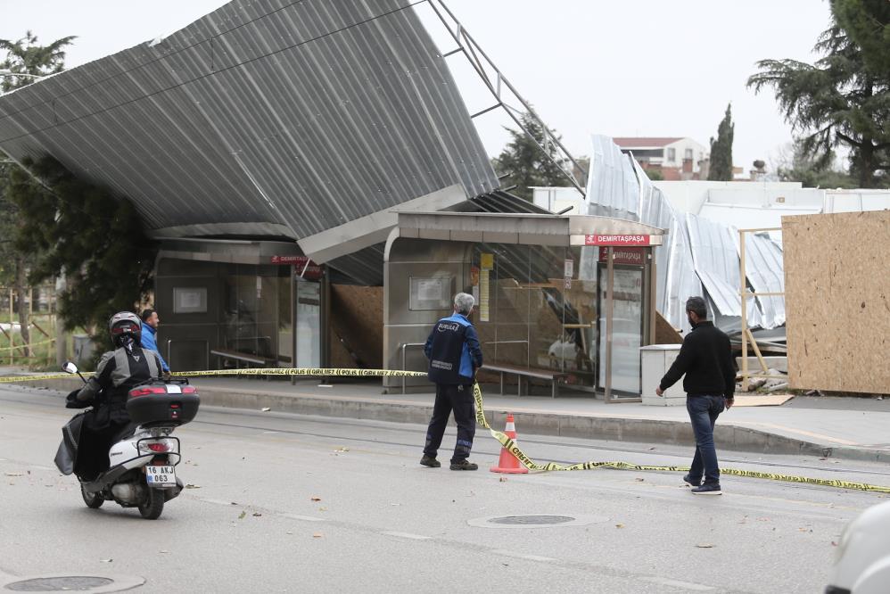 Merkez Osmangazi ilçesi İnönü Caddesi’nde uçan bir çatı, Muammer Sencer Polis Merkezi yanında hareket halindeki tramvayın üzerine düştü. Maddi hasar meydana gelirken, yolcular büyük korku yaşadı. Tramvay, çatının kaldırılmasıyla yoluna devam etti