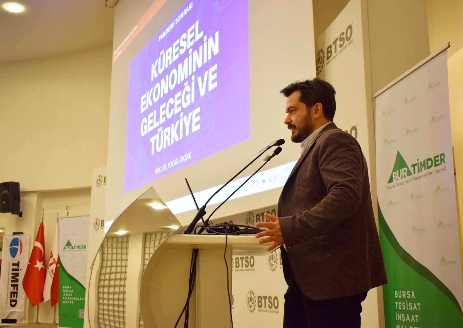Etkinliğin konuşmacısı olan Uludağ Üniversitesi Öğretim Üyesi Doç. Dr. Yüksel Okşak da sunumunda dünya ve Türkiye ekonomisini değerlendirdi. Mevcut ekonomik sistemlerin sorunlara çözüm olmadığının altını çizen Okşak, dünya ekonomisinde bir değişim olduğunu anlattı. Gelişmekte olan ülkelerin küresel ekonomiden daha fazla pay almaya başladığını belirten Okşak, küresel borç stoğunun arttığını, gelişmiş ülkelerdeki önemli şirketlerin iflas ettiğini, Singapur ve Türkiye gibi ülkelerin sanayi üretiminde en iyiler arasında olduğunu söyledi.