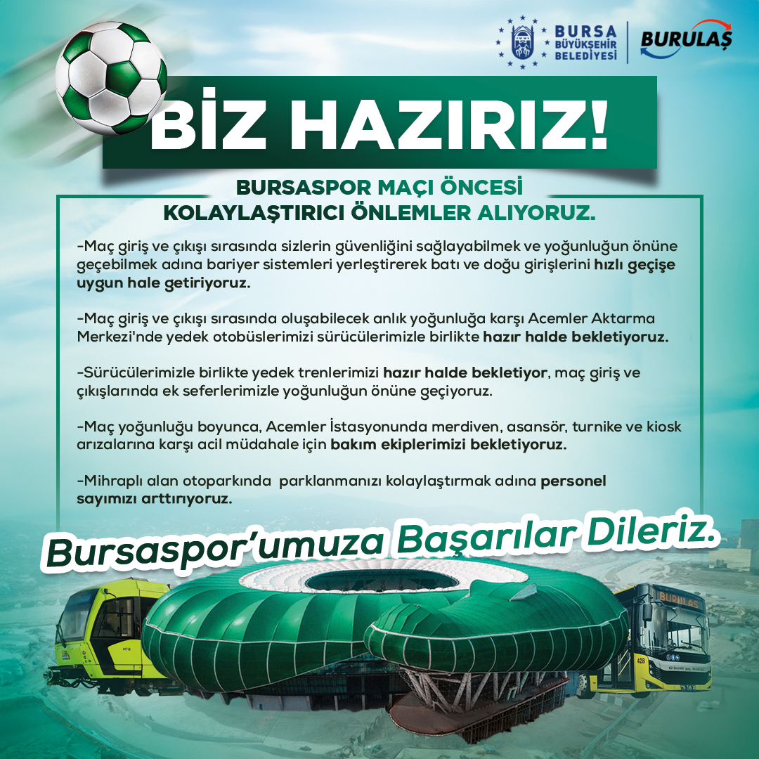 Yüzüncü Yıl Atatürk Stadyumu’nda saat 19.00’da başlayacak olan 3.ligin 6. hafta karşılaşması için bölgede oluşacak yoğunluğa karşı ulaşımda alınan önlemleri duyuran BURULAŞ, maç giriş ve çıkışı sırasında güvenliğini sağlayabilmek ve yoğunluğun önüne geçebilmek adına bariyer sistemleri yerleştirerek batı ve doğu girişlerini hızlı geçişe uygun hale getirdiklerini belirtti.