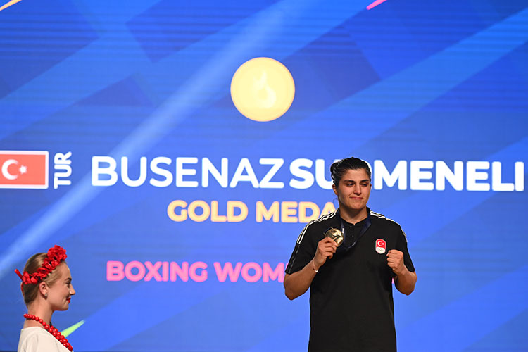 Madalya töreninde İstiklal Marşı’nı salonda dinlettiren Busenaz Sürmeneli’ye altın madalyasını Türkiye Milli Olimpiyat Komitesi (TMOK) Başkan Yardımcısı ve Avrupa Oyunları Koordinasyon Komisyonu Başkanı Hasan Arat takdim etti.