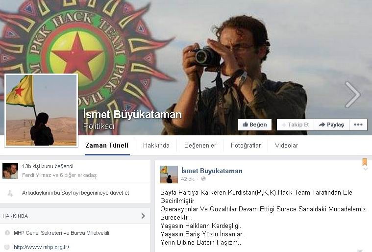 MHP Genel Sekreteri İsmet Büyükataman’ın Facebook hesabı, PKK tarafından ele geçirilerek, profil fotoğrafı değiştirildi, terör örgütünün sembolleri yerleştirildi. Sayfanın girişine de bunların terör örgütünün hack timi tarafından yapıldığı yazıldı. İsmet Büyükataman da, kendi hesabından olayı duyurarak, “Beğen sayfamız PKK’lı hain bölücüler tarafından ele geçirilmiştir. Bölücü terörle mücadelemiz her alanda devam edecektir” dedi.