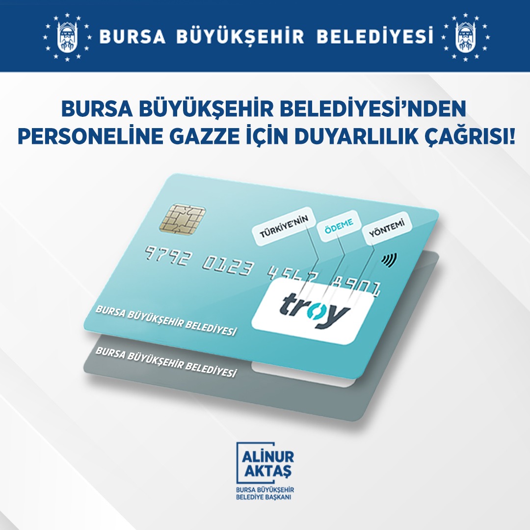 Gazze’de masum insanları katleden İsrail ile İsrail’in savaş suçlarına açıkça desteğini ilan eden şirketlerin ürün ve mallarının boykot edilmesine yönelik toplumsal duyarlılığa destek veren Büyükşehir Belediyesi, BUSKİ ve iştirakler de dahil tüm personelin yerli ve milli ödeme yönetimi TROY’a geçişi için düğmeye bastı. Troy Kart’a geçiş için Yapı ve Kredi Bankası ile görüşme yapılırken, banka ile personel arasında ürün sözleşmelerinin bireysel olarak yapıldığı, bu nedenle de geçiş işleminin ancak bireysel başvuruyla yapılabileceği belirtildi.