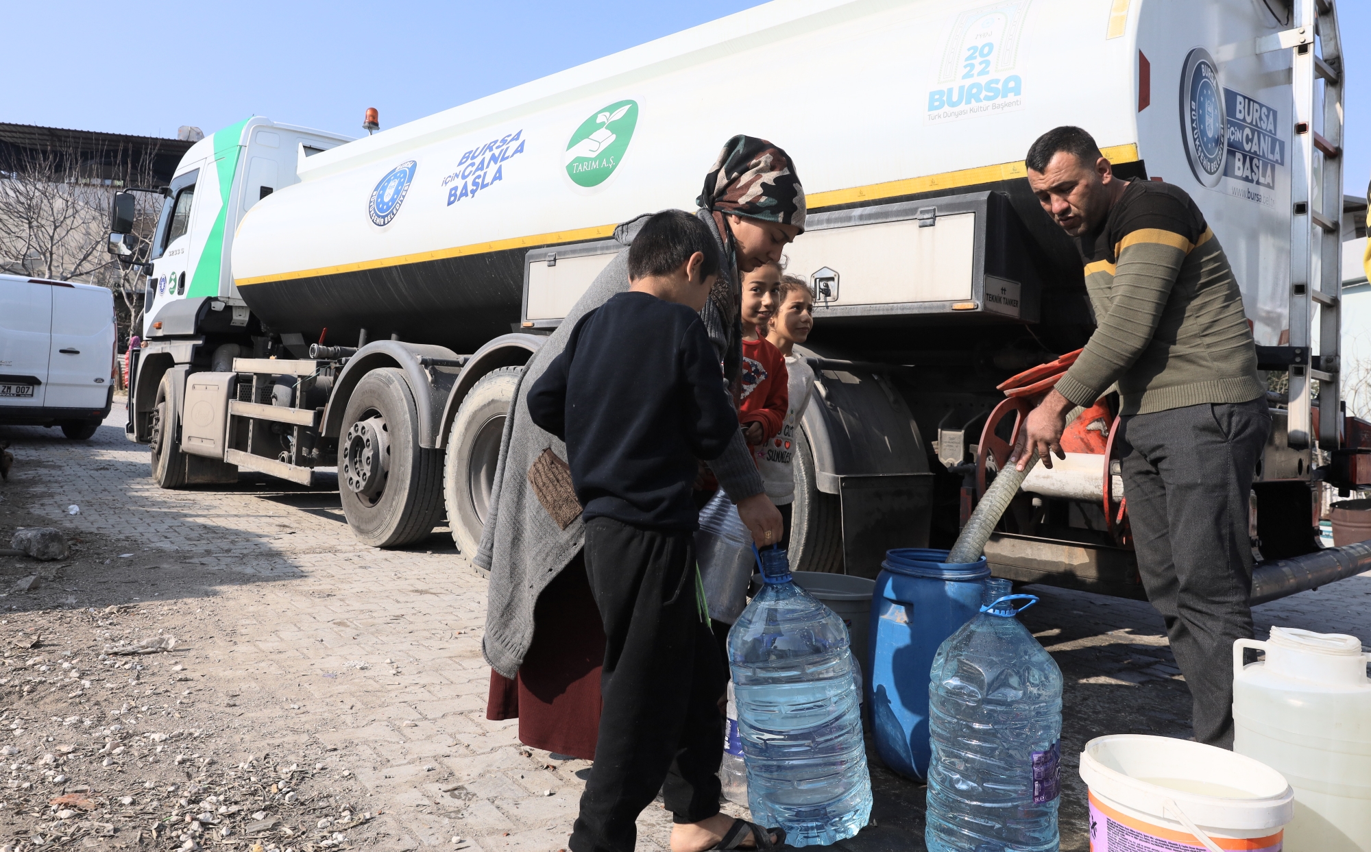 Büyük depremin ikinci haftasında Hatay’da görevlendirilen ve geçici barınma alanları oluşturmak, yardımların dağıtımını koordine etmek ve seyyar tuvaletler kurmakla görevlendirilen Bursa Büyükşehir Belediyesi, bunun yanı sıra depremzedelerin tüm ihtiyaçlarını karşılamaya çalışıyor. Kullanma suyu temininde yaşanan zorluk nedeniyle Tarım ve Peyzaj A.Ş. marifetiyle 5 su tankeri ile sahaya inen Büyükşehir Belediyesi, vatandaşın imdadına yetişiyor. Ekipler; rutin olarak seyyar tuvaletlerin depolarına su takviyesi yapmanın yanında, mahalle mahalle sokak sokak gezip, vatandaşların kullanma suyu ihtiyacını karşılıyor. Her sabah 5 tankerle sahaya çıkan ekipler, güneş batana kadar defalarca tur atıp, her gün 300 ton suyu Hataylılarla buluşturuyor.