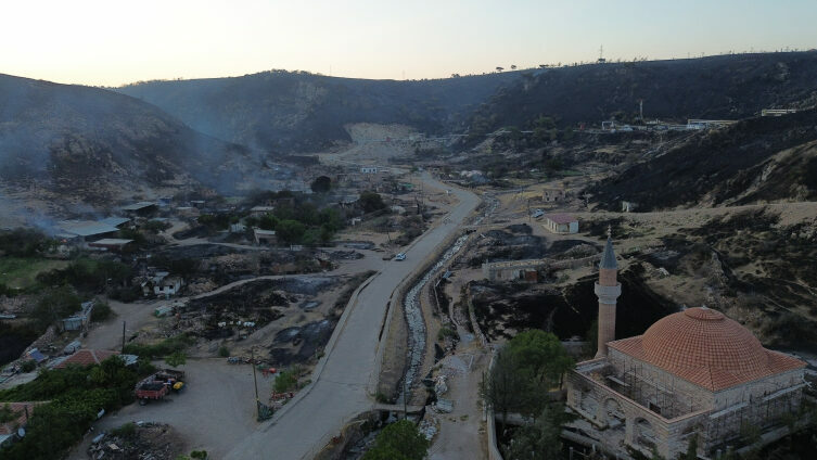 Öte yandan, yangından etkilenen ve içinde jeotermal santral ile tarihi Hüdavendigar Cami’nin bulunduğu Tuzla köyü dron ile havadan görüntülendi.