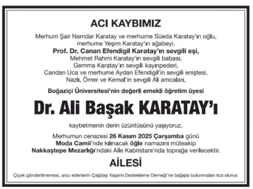 Karatay ailesi Dr. Ali Başak Karatay’ın cenaze programına ilişkin açıklama yaptı. Karatay’ın 26 Kasım 2025 Çarşamba günü Moda Camii’nde kılınacak öğle namazının ardından Nakkaştepe Mezarlığı’ndaki aile kabristanına defnedileceği bildirildi.