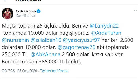 Öte yandan Cedi Osman’ın başlattığı kampanyanın ardından binlerce vatandaş AFAD’ın organizasyonu aracılığıyla depremzedelere yarımda bulundu. DEPREM yazıp 1866’ya SMS atanlar ve bu sayede 10 TL bağışta bulunan vatandaşlar, telefonlarından aldıkları ekran görüntülerini Cedi Osman’la paylaştı.