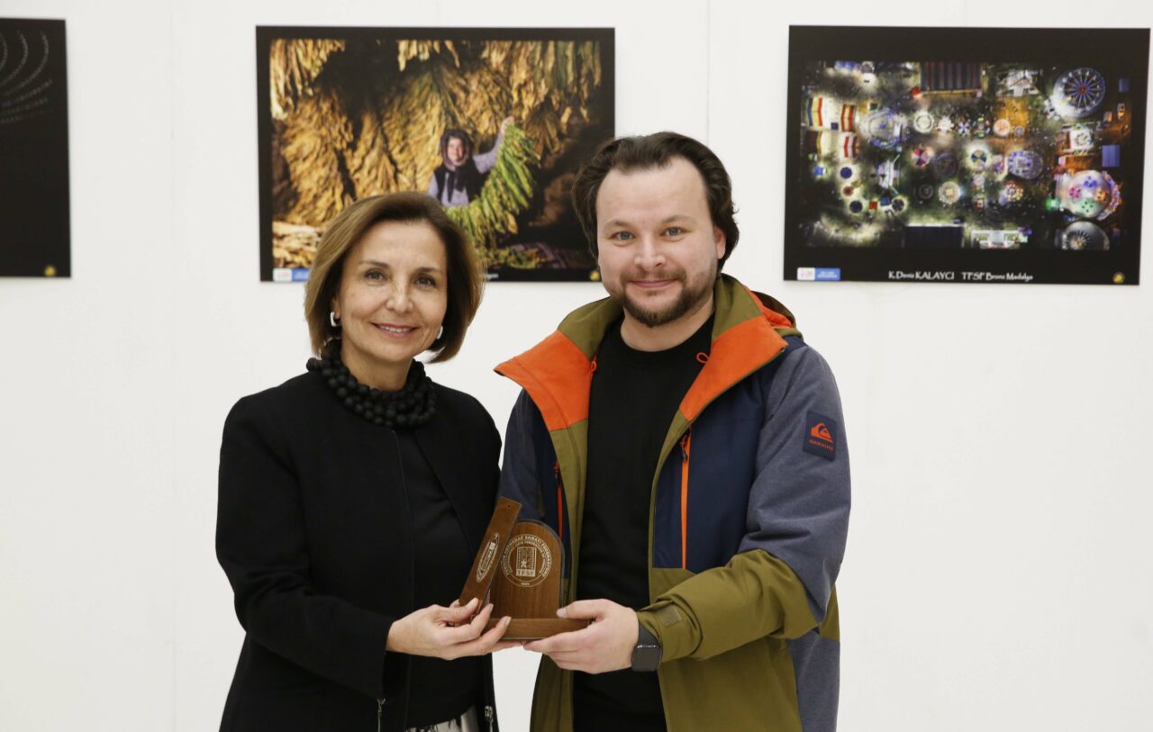 Yarışmada üçüncü olarak bronz madalyaya uzanan İstanbul Üsküdar Üniversitesi Öğretim Elemanı Kudret Deniz Kalaycı adına Serdar Kıran da ödülü ÇEK Yönetim Kurulu Başkanı Nihan Alpay’ın elinden aldı.