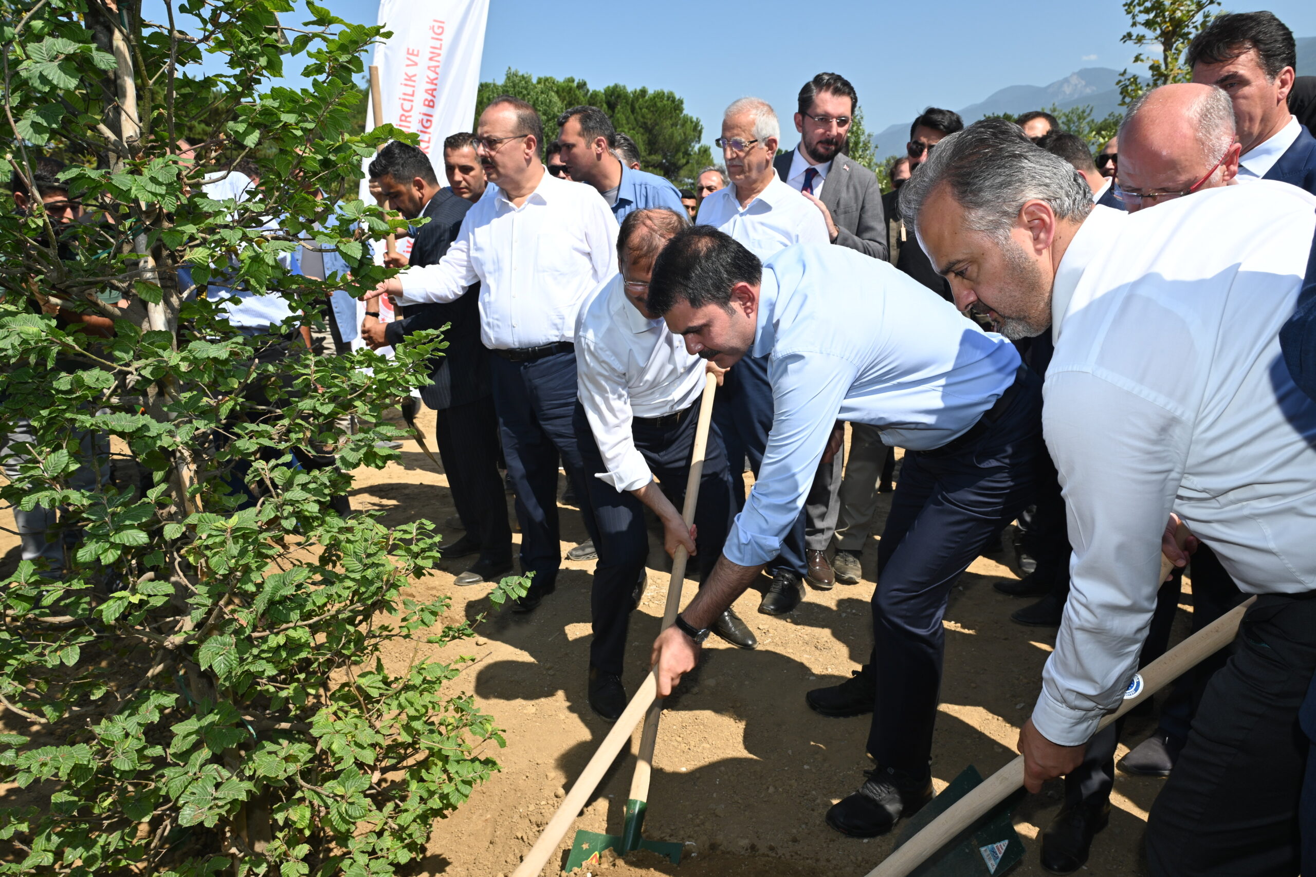 Bakan Murat Kurum, Başkan Alinur Aktaş ve beraberindekiler daha sonra anı olarak kütüğe isimlerinin bulunduğu plakaları çaktı. Ardından Bakan Kurum ve yanındakiler ilk fidanı toprakla buluşturarak can suyunu verdi.