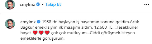 Sosyal medyayı aktif kullanan Cem Yılmaz sosyal medyadan emekli olduğunu duyurdu. Yılmaz şu ifadeleri kullandı; 1988 de başlayan iş hayatımın sonuna geldim. Artık Bağkur emeklisiyim ilk maaşımı aldım. 12.680 TL …Tesekkürler hayat çok çok mutluyum…Ciddi görüşmek isteyen emeklilerle görüşürüm.