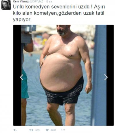Aldığı kilolarla sosyal medyada çok konuşulan Yılmaz, paylaştığı bir fotoğrafla kendini Ti’ye aldı. Komedyen göbeğini büyüttüğü bir fotoğrafı paylaşarak, “Ünlü komedyen sevenlerini üzdü! Aşırı kilo alan komedyen, gözlerden uzak tatil yapıyor” notunu yazdı.