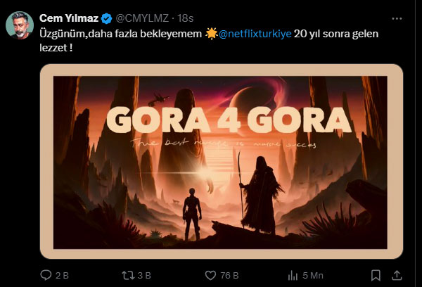 Başrollerinde Cem Yılmaz, Özge Özberk, Özkan Uğur, Rasim Öztekin, Ozan Güven ve Şafak Sezer gibi isimlerin bulunduğu G.O.R.A filmi 2004 yılında vizyona girmişti. Cem Yılmaz, G.O.R.A’ nın devam filminin çekileceğini duyurdu. Cem Yılmaz sosyal medya hesabında “Üzgünüm, daha fazla bekleyemem. 20 yıl sonra gelen lezzet!” diyerek müjdeyi verdi.