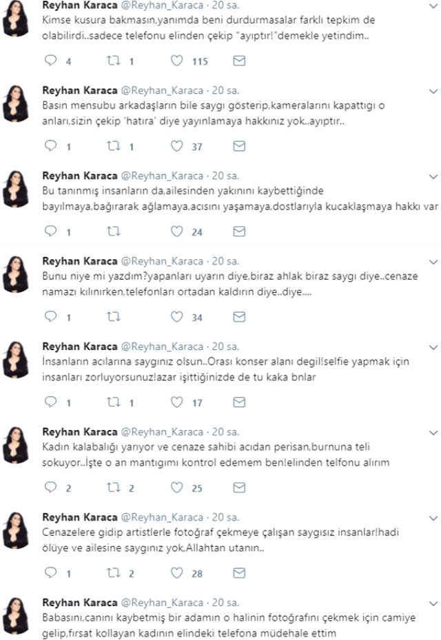 Telefonunu elinden aldığı kadına ‘ayıptır’ dediğini belirten Reyhan Karaca, “Selfie yapmak için insanları zorluyorsunuz! Azar işittiğinizde de ‘tu kaka bunlar’ oluyor. Bunu niye mi yazdım? Yapanları uyarın diye, biraz ahlak biraz saygı diye. Cenaze namazı kılınırken, telefonları ortadan kaldırın diye. Bu tanınmış insanların da, ailesinden yakınını kaybettiğinde bayılmaya, bağırarak ağlamaya, acısını yaşamaya, dostlarıyla kucaklaşmaya hakkı var. Basın mensubu arkadaşların bile saygı gösterip kameralarını kapattığı o anları sizin çekip ‘hatıra’ diye yayınlamaya hakkınız yok, ayıptır! Kimse kusura bakmasın, yanımda beni durdurmasalar farklı tepkim de olabilirdi. Sadece telefonu elinden çekip ‘ayıptır’ demekle yetindim” tweetlerini attı.