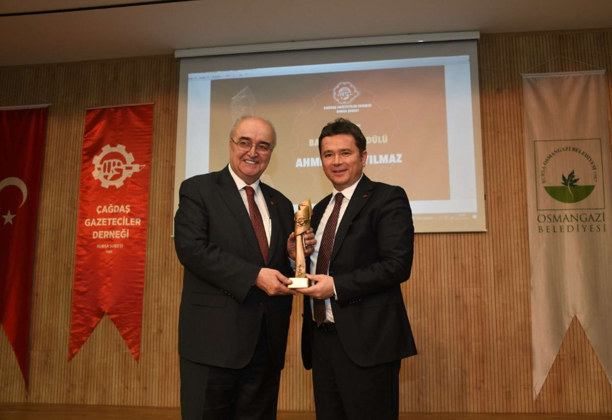 Ahmet Emin Yılmaz ödülünü Osmangazi Belediye Başkanı Erkan Aydın’ın, Taha Tütüncü de Bursa Barosu Başkanı Av. Metin Öztosun’un elinden aldı…