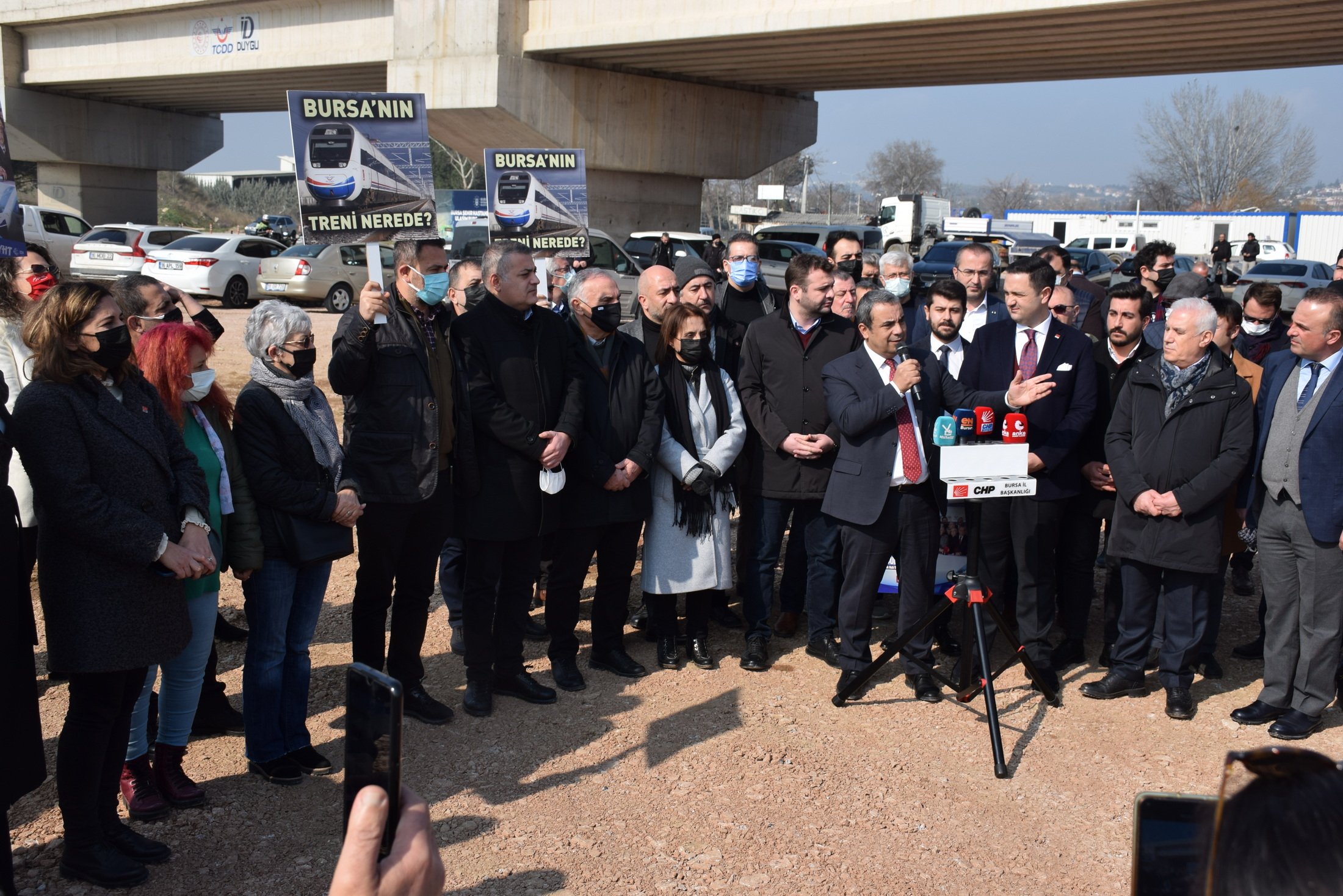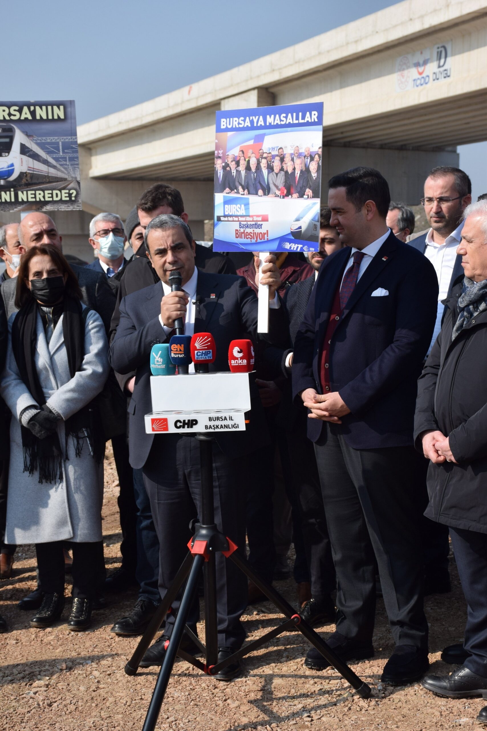 CHP Genel Başkanı Kemal Kılıçdaroğlu’nun maliyet rakamlarıyla ilgili eleştirilerine hedef olan Osmaneli-Yenişehir-Bursa-Bandırma Yüksek Standartlı Demiryolu projesi gündemden düşmüyor. “Yüksek Hızlı Tren” adı altında 2012’de başlayan Bursa demiryolu projesi 10 yılda tamamlanamadığı gibi bu kez de hedef olarak 2023 tarihi gösteriliyor. CHP Bursa İl Başkanı İsmet Karaca, PM Üyeleri Hasan Efe Uyar ve Umut Akdoğan’ın yanı sıra ilçe başkanları, Kadın ve Gençlik Kolları üyeleri ile CHP Bursa Büyükşehir Belediye Başkan adayı Mustafa Bozbey’in de katılımıyla Balat’taki YHT şantiyesi önünde basın açıklaması yaptı.