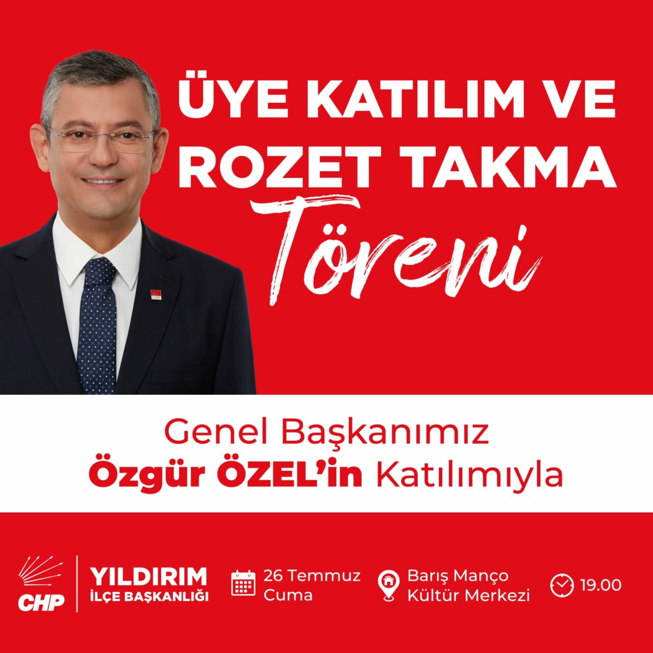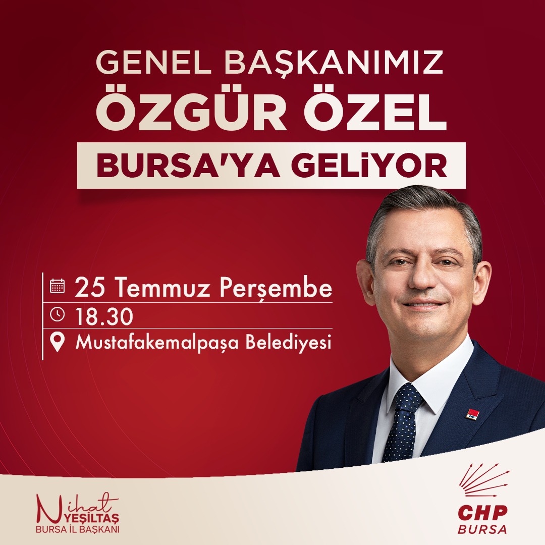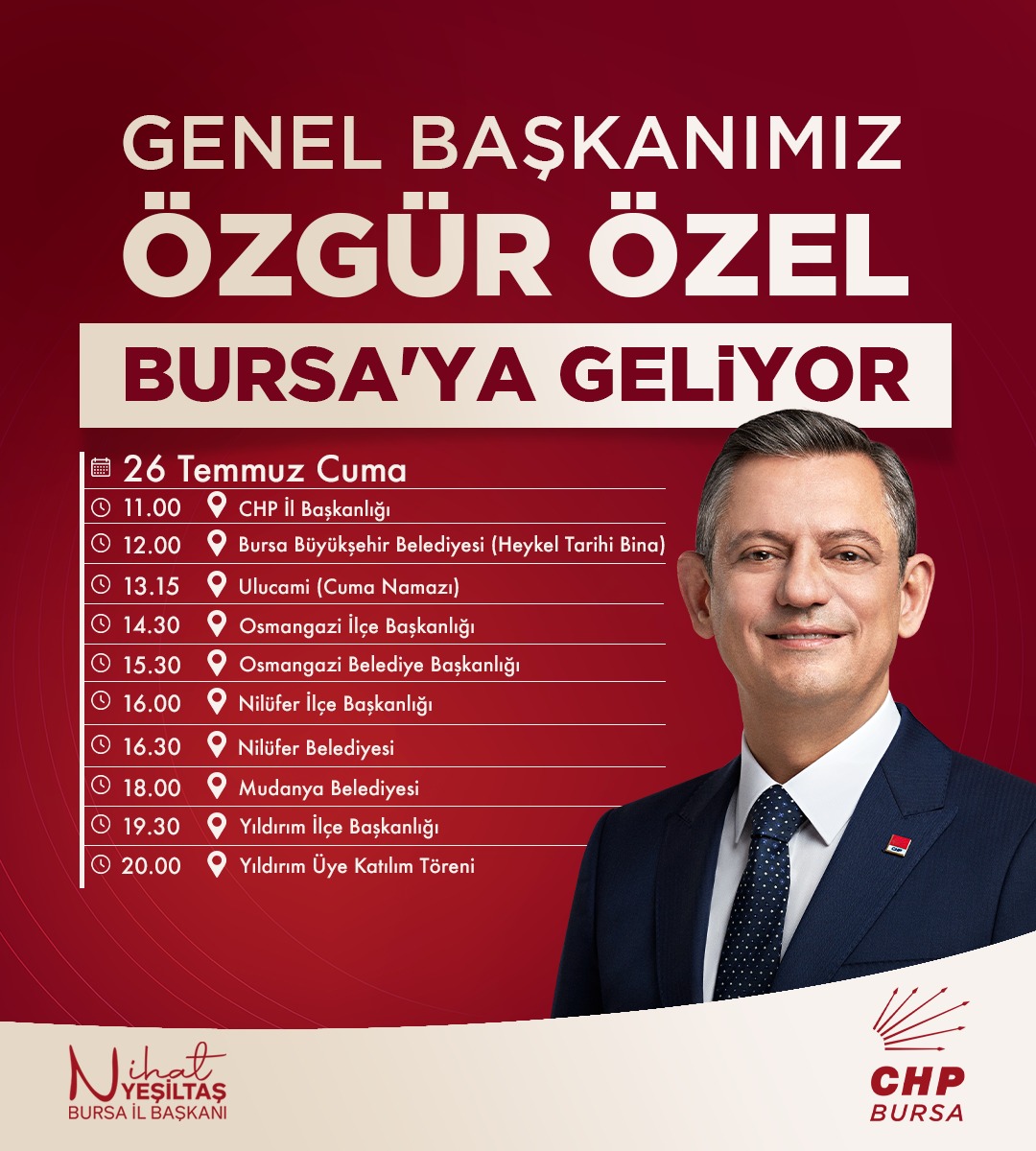Cumhuriyet Halk Partisi (CHP) Genel Başkanı Özgür Özel, 25 Temmuz perşembe günü Bursa’ya geliyor. Özel’in ilk durağı Mustafakemalpaşa olacak. Ardından 26 Temmuz cuma günü yoğun bir programa katılacak olan Özel, ilk olarak CHP İl Başkanlığı’na yapacağı ziyaretin ardından sırasıyla; Bursa Büyükşehir Belediyesi, Osmangazi,Nilüfer, Mudanya İlçe Başkanlıklarıyla Belediyeler, Yıldırım İlçe Başkanlığı ve rozet takma törenine gidecek. Yıldırım İlçe Başkanlığı tarafından düzenlenecek yeni üye katılım ve rozet takma töreninde eski CHP Genel Başkanı Murat Karayalçın ve örgütlenmeden sorumlu Genel Başkan Yardımcısı Ensar Aytekin de hazır bulunacak.