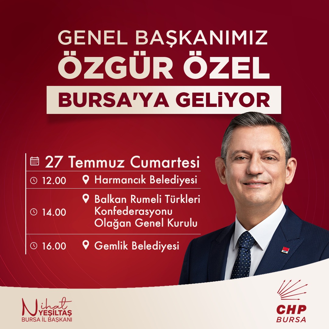 Özgür Özel, cumartesi günü Harmancık ve Gemlik Belediyeleri ile birlikte Balkan Rumeli Konfederasyonu Olağan Genel Kurulu’na katıldıktan sonra Bursa’dan ayrılacak.
