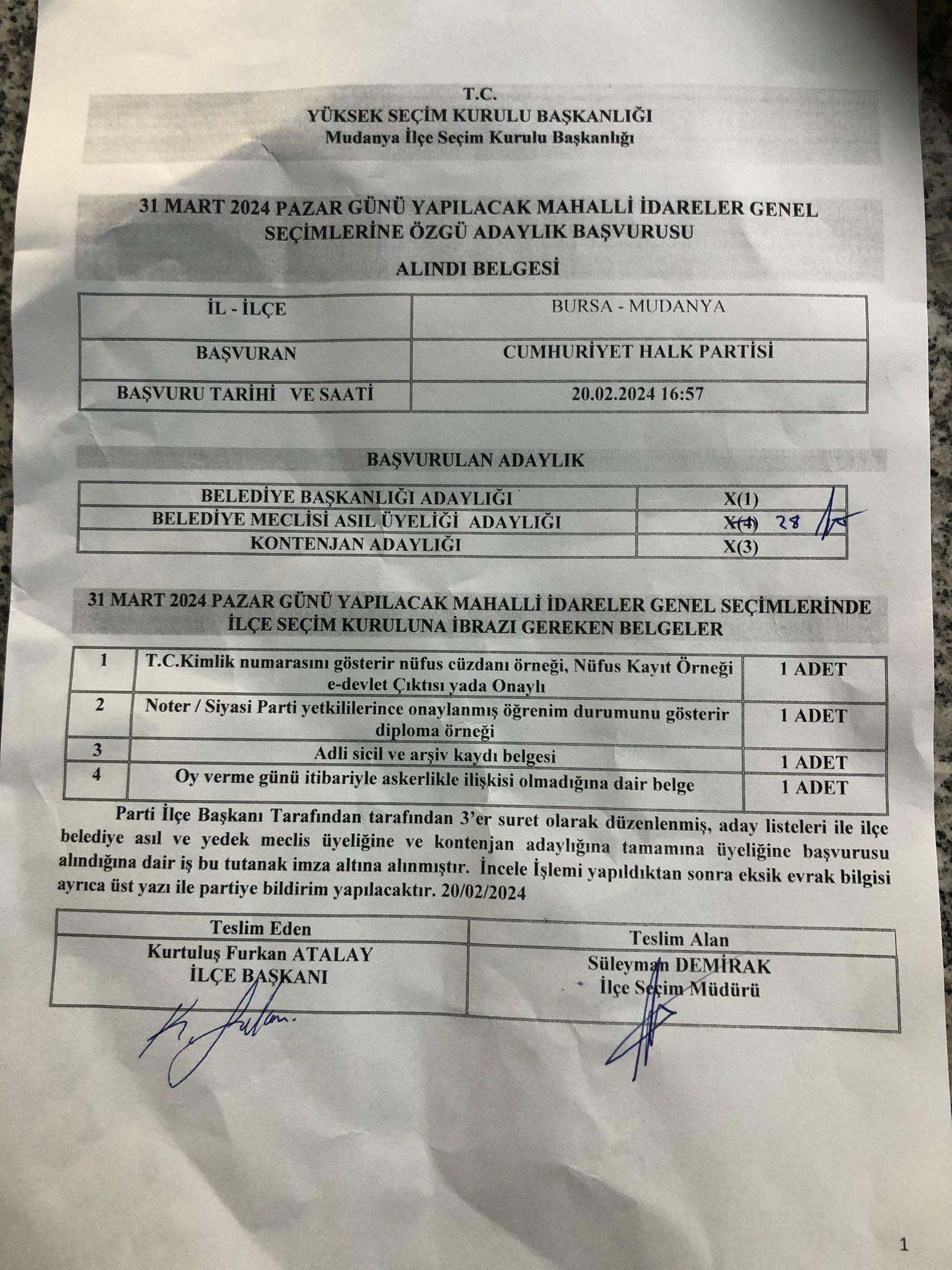 “İlçe Başkanımız meclis üyelikleri listesini teslim etmek üzere bugün saat 16:48’de adliyeye girdi. Saat 16:57’de ise ıslak imzalı 3 nüshanın teslim alındığına dair belge İlçe Seçim Kurulu tarafınan bize iletilmiştir. Bu durum hem YSK’nın sistemine girildi, hem de evrak olarak düzenlendi. İspatları ve resmi kanıtları ile birlikte durum ortadadır. Zaten belgeler kamuoyuyla da paylaşılmıştır. Mudanya’da ve Bursa’da her şey usulüne uygun olarak yürütülmüştür. Geçtiğimiz seçim döneminde de Mudanya’da aynı kişiler tarafından benzer bir durum yaşatılmıştı. Sonucunda da bugün olduğu gibi yine bir şey çıkmamıştı. Bugün de yaptıkları itiraz İlçe Seçim Kurulu tarafından reddedildi. Görüyoruz ki hukuksuzluğu bir yaşam biçimi haline getirmiş olanlar yine eli boş döndüler. Sandıkta kaybedeceklerini anlayınca algı oyunlarıyla seçime gölge düşürmeye çalışıyorlar. Ama vatandaşımız gerçeğin ne olduğunu biliyor. Vatandaşımız bunlara hak ettiği dersi vererek Mudanya’da gülümsemeye devam edecektir.”