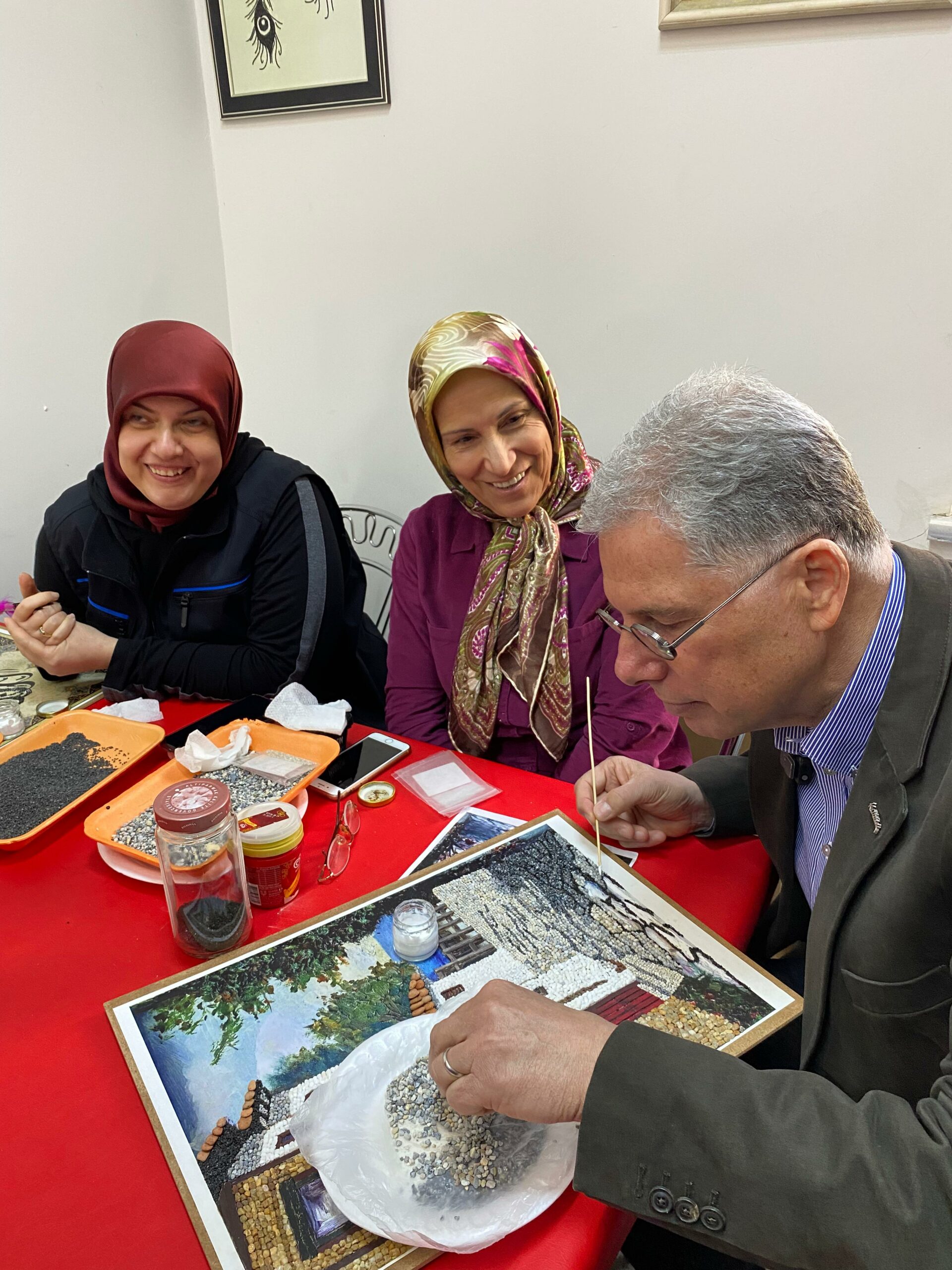 Kadınların emeklerine ve eserlerine hayran kalan Dalgıç, kadınlarla birlikte taş boyama ve yün keçe işleme atölyelerine katılarak üretkenliğe ortak oldu.