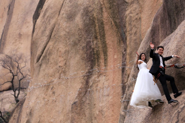 Düğün fotoğrafları için Chaya Dağı’nı seçen çift, ülkenin Henan bölgesindeki dağa tırmanmak için büyük çaba sarf etti. Yaklaşık 100 metre yüksekliğindeki dağın üzerinde çektirdikleri fotoğraflar ülkede büyük ilgi çekti. Çılgın ikili uçurumun içine gömülmüş metal sivri uçların üzerinde dururken, uzaktan bakıldığında neredeyse havada ayakta duruyor yanılsaması yaratmayı başardı.