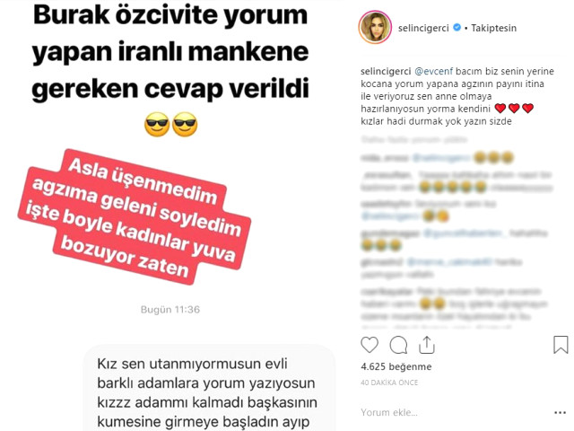 Ünlü modele attığı mesajın ekran görüntüsü paylaşan Selin Ciğerci, “Burak Özçivit’e yorum yapan İranlı mankene gereken cevap verildi. Asla üşenmedim ağzıma geleni söyledim. İşte böyle kadınlar yuva bozuyor zaten. Fahriye Evcen, bacım biz senin yerine kocana yorum yapana ağzının payını itina ile veriyoruz. Sen anne olmaya hazırlanıyorsun yorma kendini. Kızlar hadi durmak yok yazın sizde.” dedi.