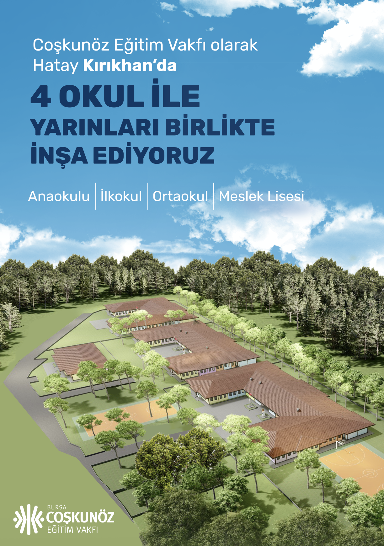Deprem felaketinin ardından afet bölgesine destek için ilk andan itibaren seferber olan Coşkunöz Eğitim Vakfı, deprem sonrası bölgedeki yardım faaliyetlerini sürdürüyor. Kurulduğu günden bu yana 35.000 bireyin hayatına dokunan Coşkunöz Eğitim Vakfı, Hatay’ın Kırıkhan ilçesinde öğrencilerin eğitimlerine devam edebilmeleri için bir eğitim kompleksi hayata geçiriyor. Vakıf Millî Eğitim Bakanlığı ile imzalanan protokol kapsamında farklı yaş gruplarından anaokulu, ilkokul, ortaokul ve gıda teknolojileri meslek lisesi olmak üzere 4 adet okul inşa ediyor. Eğitim kompleksi, 2023-2024 eğitim öğretim yılının başlamasıyla birlikte hizmete açılacak. Çelik konstrüksiyon olarak inşa edilecek okulların mimari tasarımları, Hatay’ın geleneksel mimarisinden izler taşıyacak. 4 yeni okul binasında yaklaşık 1000 öğrencinin eğitim alması planlanıyor.