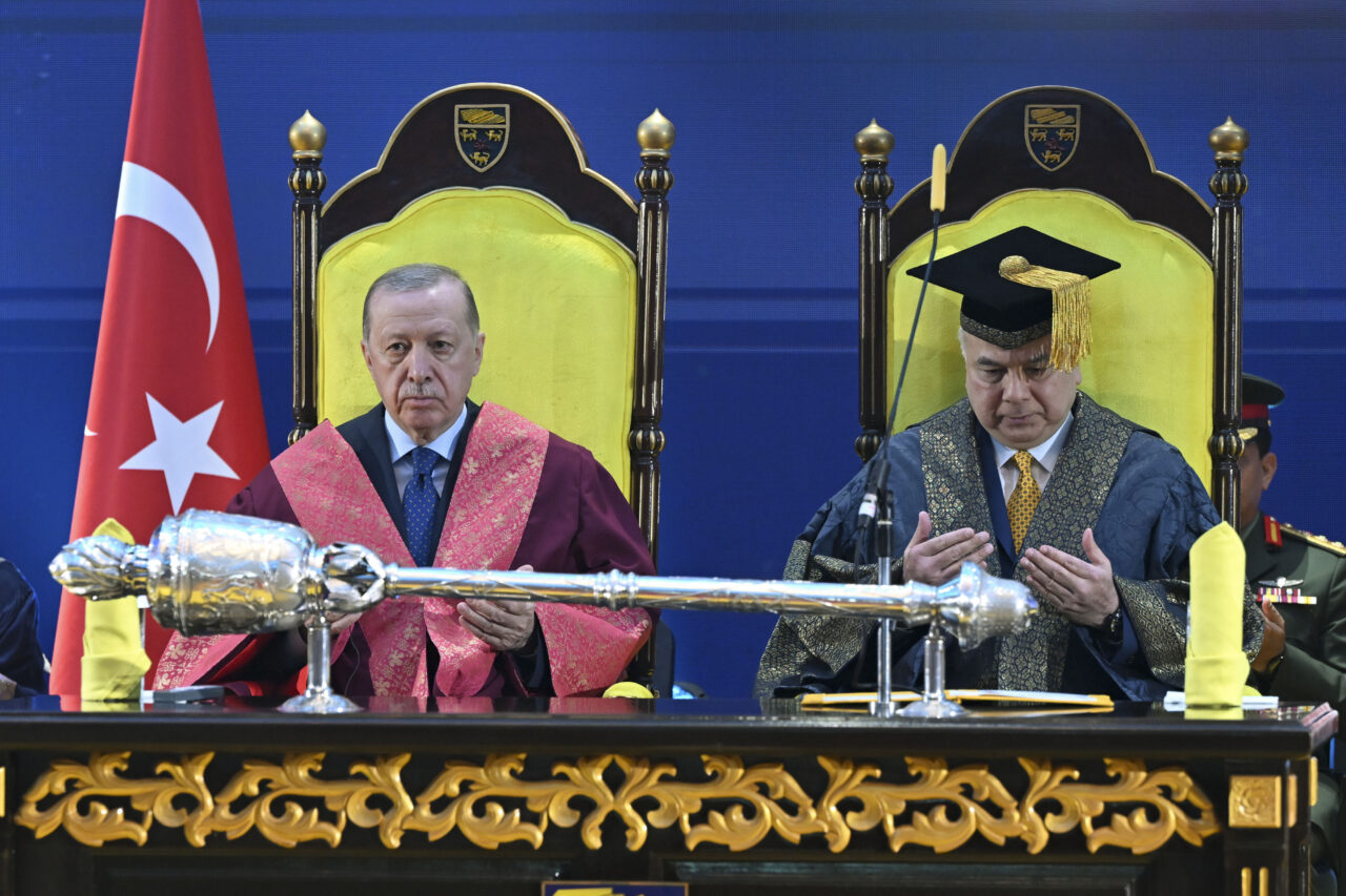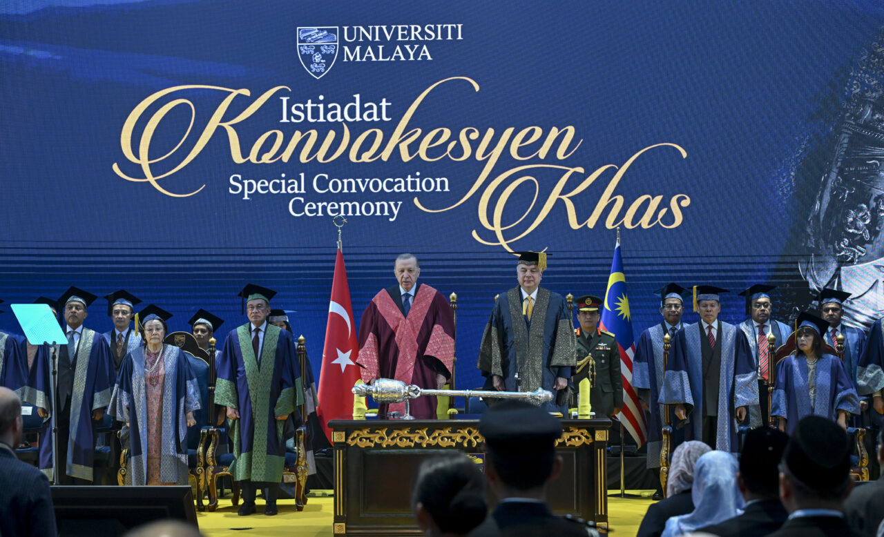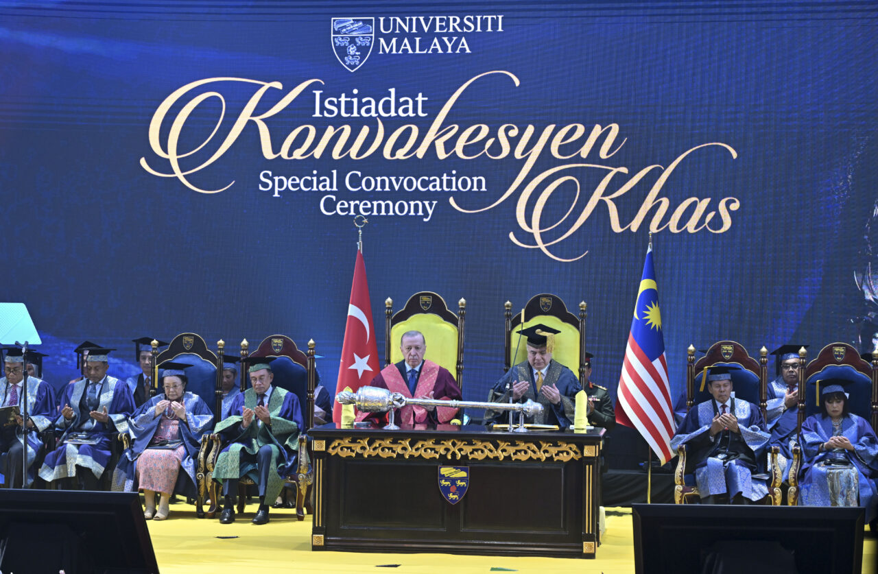 Erdoğan’a, Putrajaya Uluslararası Kongre Merkezi’nde Perak Sultanı Nazrin Şah tarafından fahri doktora beratı takdim edildi.