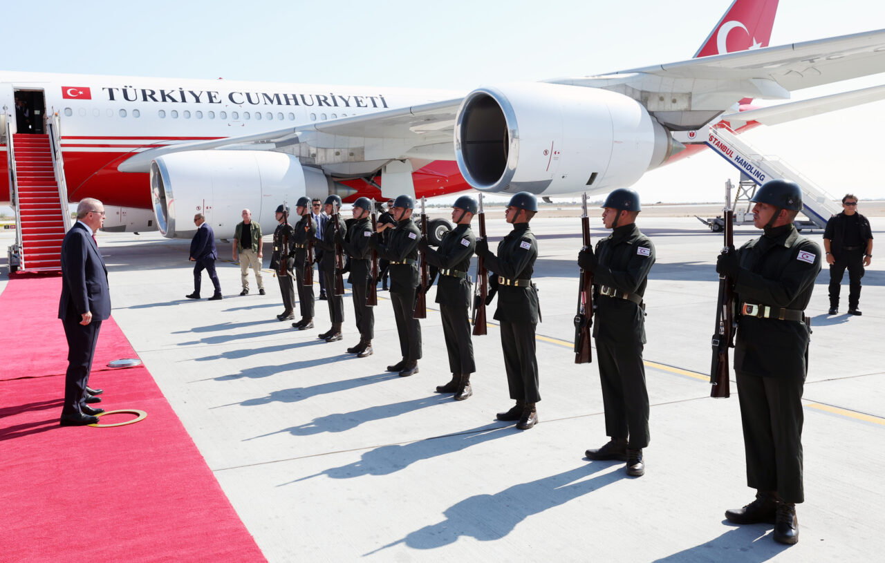 Erdoğan, Ercan Havalimanı’nda, KKTC Cumhurbaşkanı Ersin Tatar tarafından resmi törenle karşılandı.