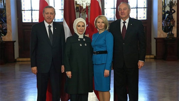 Törenin ardından tarihi binaya geçen Erdoğan, Berzins ve eşleri iki ülke bayraklarının önünde fotoğraf çektirdi.