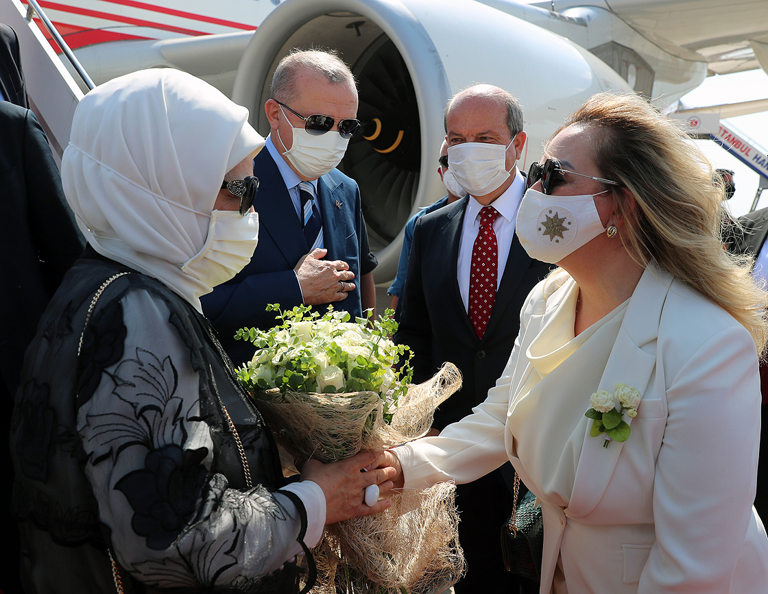 Özel uçakla yerel saatle 15.40’da Ercan Havalimanı’na gelen Erdoğan, KKTC Cumhurbaşkanı Tatar tarafından resmi törenle karşılandı.