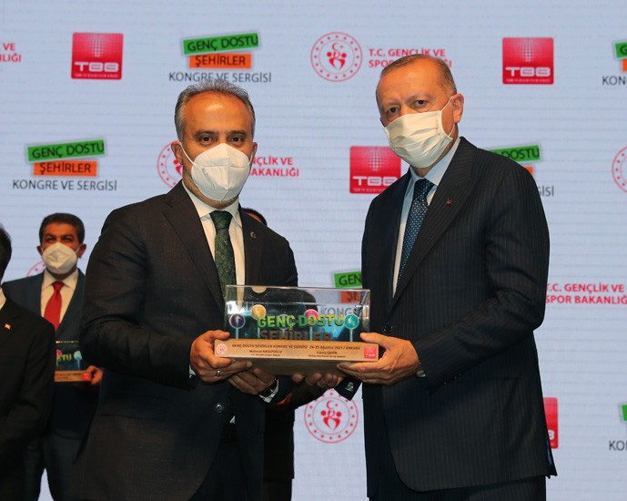 Türkiye Belediyeler Birliği ile Gençlik ve Spor Bakanlığının ev sahipliğinde düzenlenen Genç Dostu Şehirler Kongre ve Sergisi, Cumhurbaşkanı Recep Tayyip Erdoğan’ın katılımlarıyla Ankara ATO Congresium Kongre ve Sergi Merkezi’nde yapıldı. Kongrede, Genç Dostu Şehirler Fikir ve Proje Yarışması’na katılan belediyelerden dereceye giren 22 belediyeye ödülleri verildi. Bursa Büyükşehir Belediyesi de gençleri merkeze alan projeleri başta olmak Büyükşehir Gençlik Kulübü uygulamasıyla ‘Genç Dostu Şehir Ödülü’ne layık görüldü. Cumhurbaşkanı Recep Tayyip Erdoğan’ın Bursa’nın ödülünü Büyükşehir Belediye Başkanı Alinur Aktaş’a verdi.