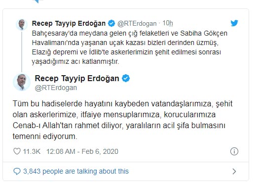 Türkiye Cumhurbaşkanı Recep Tayyip Erdoğan, Van’daki çığ düşmesi ve Sabiha Gökçen Havalimanı’nda yaşanan uçak kazasına ilişkin, “Elazığ depremi ve İdlib’de askerlerimizin şehit edilmesi sonrası yaşadığımız acı katlanmıştır. Tüm bu hadiselerde hayatını kaybeden vatandaşlarımıza, şehit olan askerlerimize, itfaiye mensuplarımıza, korucularımıza Cenabı Allah’tan rahmet diliyor, yaralıların acil şifa bulmasını temenni ediyorum.” ifadelerini kullandı.