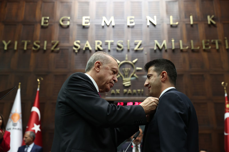 Cumhurbaşkanı Erdoğan, konuşması öncesinde Çelebi’ye rozetini taktı.