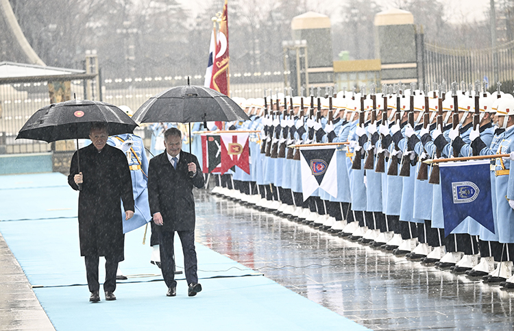 Erdoğan ve Niinistö’nün tören alanındaki yerlerini almasının ardından 21 pare top atışı eşliğinde iki ülke milli marşları çalındı. Finlandiya Cumhurbaşkanı Niinistö, Muhafız Alayı Tören Kıtası’nı “merhaba asker” diyerek Türkçe selamladı.