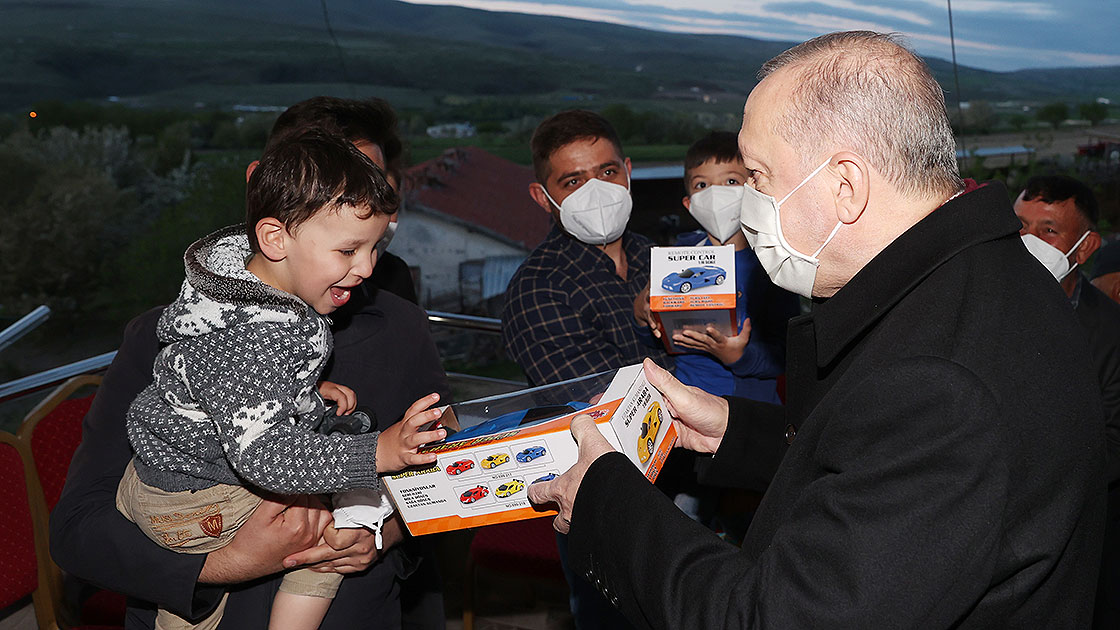 Aile üyeleriyle bir süre sohbet eden Erdoğan, çocuklara oyuncak verdi.