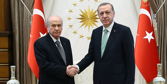 Ankara’da bugün sürpriz bir görüşmegerçekleşti. Cumhurbaşkanı Recep Tayyip Erdoğan, Beştepe’de MHP Genel Başkanı Devlet Bahçeli ile görüştü. Saat 15.00’te başlaması planan görüşme yaklaşık 10 dakikalık gecikmeyle başladı. MHP kaynakları davetin Cumhurbaşkanlığı’ndan geldiğini belirtti. Görüşme yaklaşık 1 saat sürdü.
