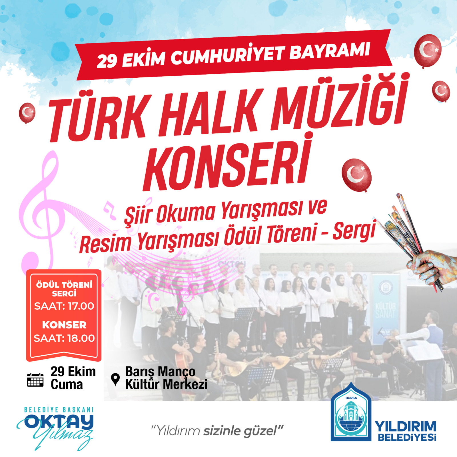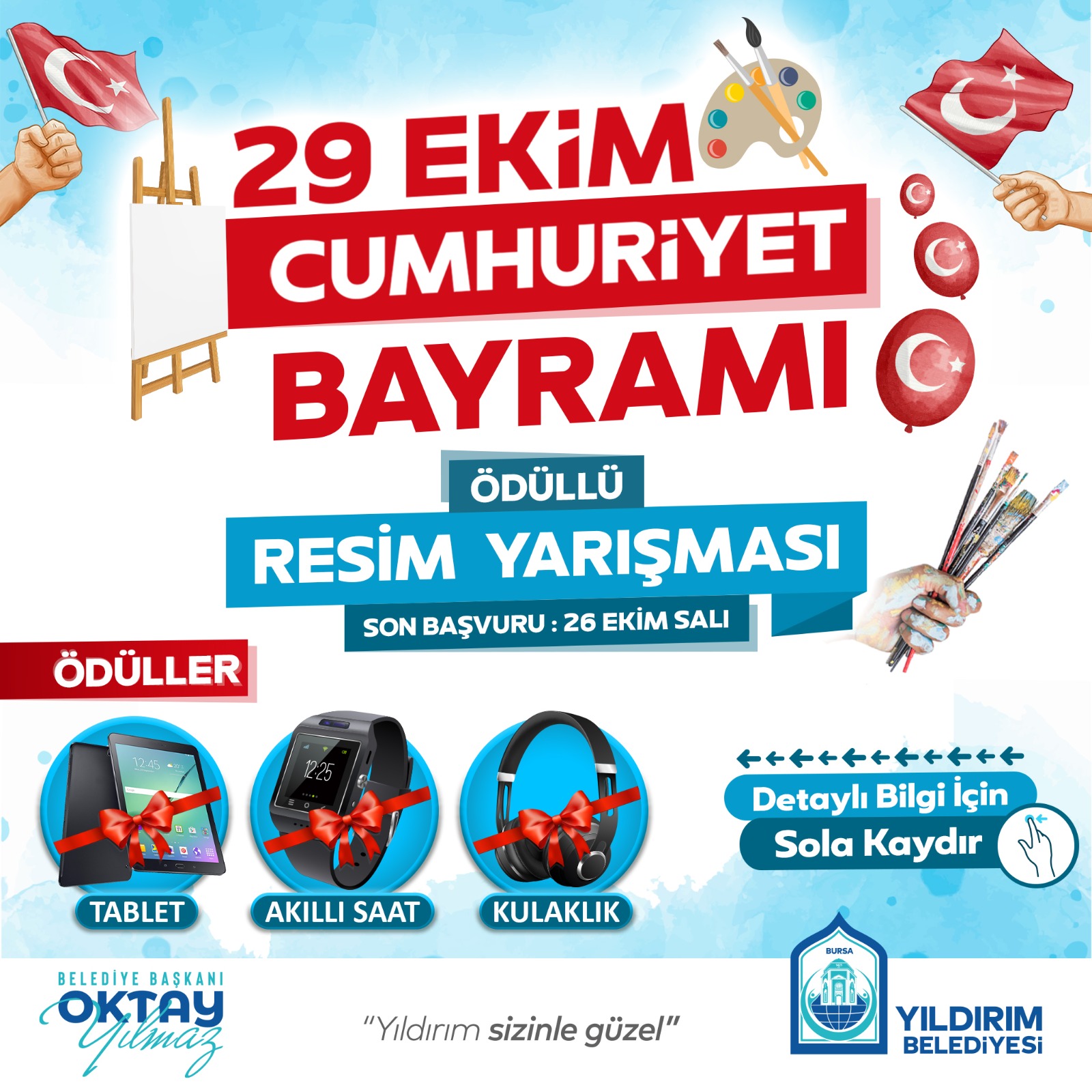 İlkokul, ortaokul ve lise olmak üzere toplamda 3 kategoride gerçekleştirilen 29 Ekim Cumhuriyet Bayramı Resim Yarışması ile Yıldırım Belediyesi, genç yeteneklerin eserlerini Barış Manço Kültür Merkezi’nde sergileyecek ve dereceye giren öğrencileri ödüllendirecek. Yine aynı şekilde 3 farklı kategoride gerçekleştirilen 29 Ekim Cumhuriyet Bayramı Şiir Okuma Yarışması’nda dereceye giren öğrencilere birbirinden özel hediyeler verilecek. Yarışmada dereceye giren öğrencilere ödülleri, 29 Ekim akşamı Barış Manço Kültür Merkezi’nde halka açık düzenlenen Türk Halk Müziği Konseri programı öncesinde verilecek.