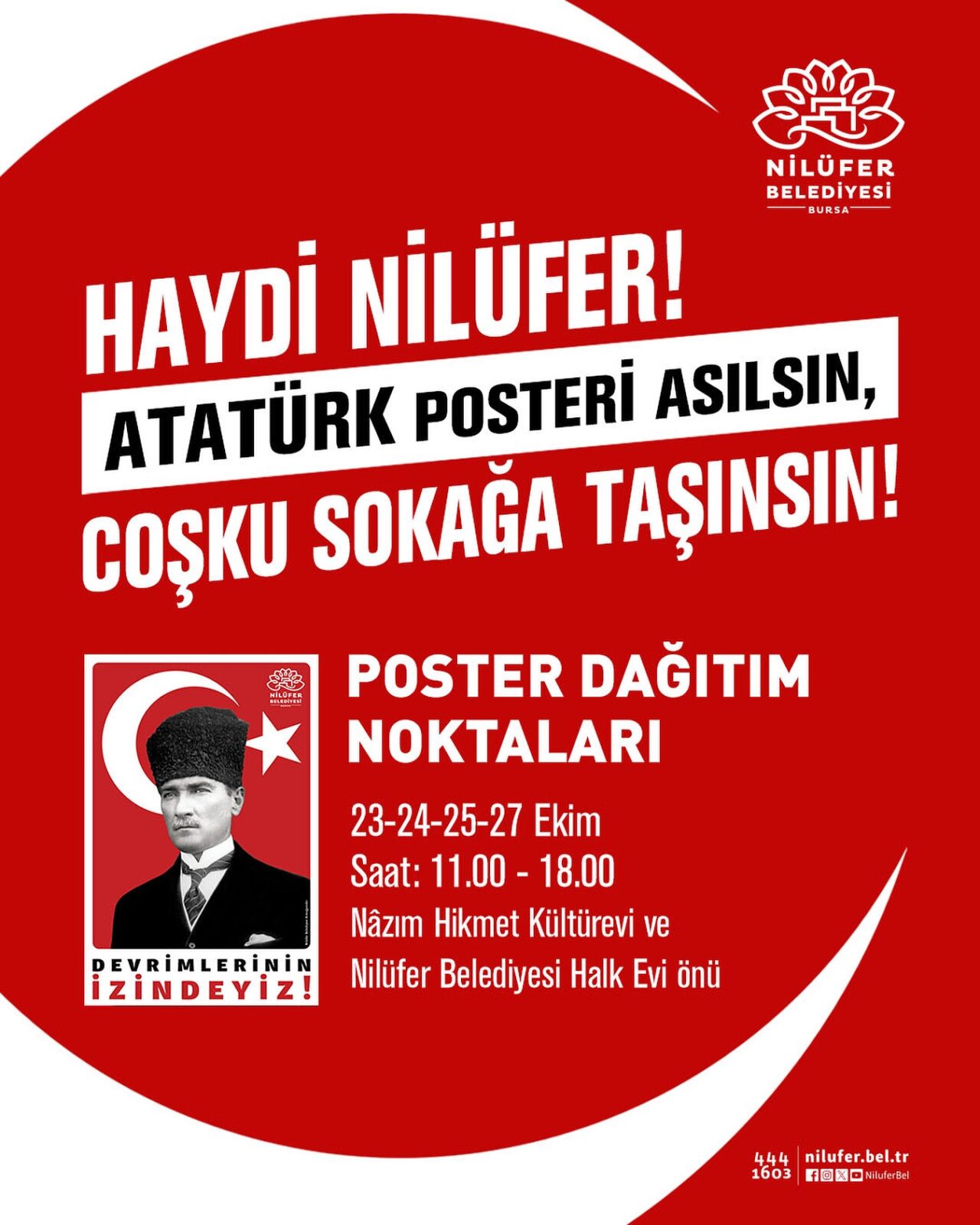 Nilüfer Belediyesi, bu bayramda da geleneği bozmayarak binlerce Atatürk posterini vatandaşlarla buluşturacak. Ulu Önder’in posterleri, 23, 24, 25 ve 27 Ekim tarihlerinde Nilüfer Belediyesi Halk Evi önü ve Nazım Hikmet Kültürevi’nden ücretsiz olarak temin edilebilecek.