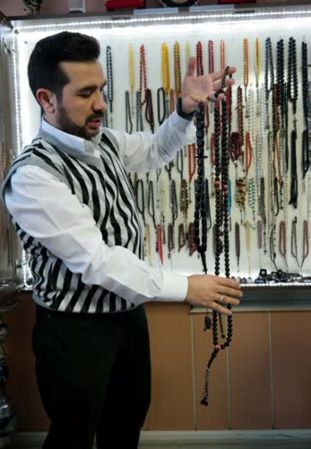 Oltu, kehribar, koç boynuzu, deve kemiği, kuka, yüssür, orijinal yakut başta olmak üzere 20 çeşit tespihinin bulunduğunu bildiren Kehribar, “Osmanlı kesmesi’ dediğimiz tespihimiz var. Yaklaşık 2 bin dolar civarında ama bunu bin dolara aldım. Fosilli tespihler var. Bunların içinde de arı, karınca, sinek olur. Bunlar da çok değerlidir” diye konuştu.