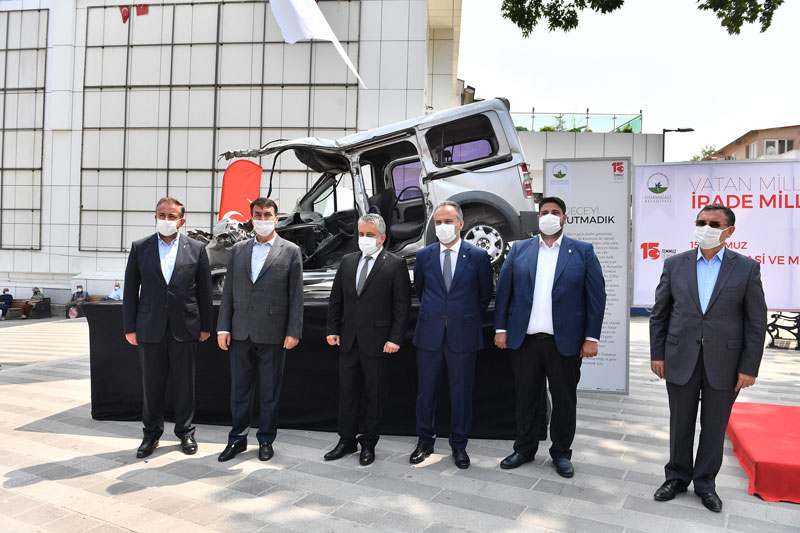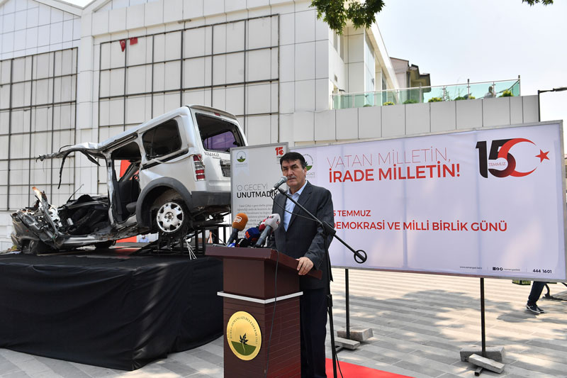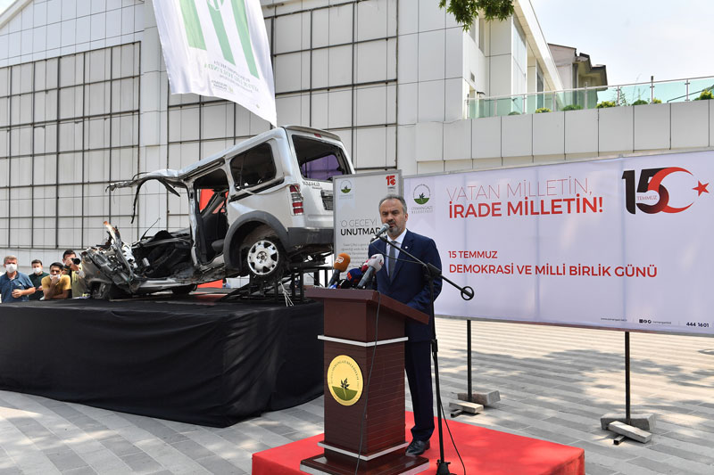 Serginin açılışında konuşan Osmangazi Belediye Başkanı Mustafa Dündar, 15 Temmuz 2016 tarihinde düzenlenen hain işgal girişimine karşı milletimizin göstermiş olduğu, mücadeleyi, azmi ve bunun karşılığında alınan zaferin tekrardan hatırladıklarını söyledi. O gece şehit olan tüm vatandaşları rahmetle andıklarını ifade eden Başkan Dündar, “O gece araçlarıyla ve bedenleri ile tankların önüne geçen vatandaşlarımızın yazdığı bu destanı, açtığımız sergi ile unutmamak ve unutturmamak istiyoruz. Aradan 4 yıl geçti. Bu 4 yıl içerisinde Türkiye kendini yeniden yapılandırdı. 15 Temmuz, Türkiye’nin değişimi, gelişimi ve yeniden ayağa kalkışının bir mücadelesi oldu. O günkü darbe girişimi ile içimizdeki hainler, ülkemize, bayrağımıza ve milletimize kastettiler. Bu millet aynı Çanakkale Savaşı’nda olduğu gibi vatanına, bayrağına, demokrasisine ve kendisine sahip çıktı. Bizlerin o geceyi, yapılan hainliği ve milletimizin yazdığı destanı her zaman hatırlamamız lazım. Burada sergilediğimiz tankın altında kalan aracı görenler, araca ne olduğu hakkında anlam vermeye çalışıyor. Bu araca bir kazadan çıkmış araca bakar gibi bakmamalıyız, vatandaşlarımız bu araca baktıklarında bir kahramanlık öyküsüne baktıklarını bilmeli” dedi.