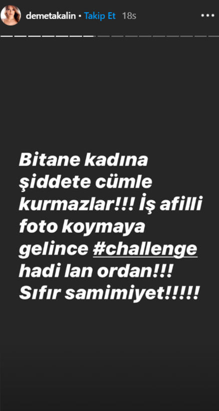 Ünlü şarkıcı Demet Akalın ise bu akıma tepki gösterdi. Akalın, sosyal medya hesabından yaptığı paylaşımda, “Bir tane kadına şiddete cümle kurmazlar! İş afilli fotoğraf koymaya gelince ‘#challenge…’ Hadi lan oradan! Sıfır samimiyet…” ifadelerini kullandı.