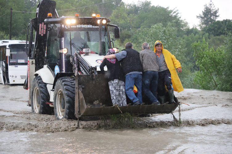 AFAD, itfaiye ve belediye ekipleri mahsur kalan vatandaşları kurtardı. Eskihisar Mahallesine Sevindik Mahallesinden ulaşımı sağlayan karayolunda çökmeler oluştu, yol suyla doldu.