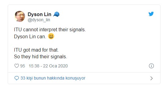 Lin’in, Twitter’dan İstanbul Teknik Üniversitesi’ni (İTÜ) eleştirmesi de dikkat çekti. “İTÜ kendi sinyallerini yorumlayamıyor. Dyson Lin yorumlayabiliyor” diyen Tayvanlı uzman, “İTÜ bu nedenle öfkelendi. Sinyallerini sakladılar” iddiasında da bulundu.