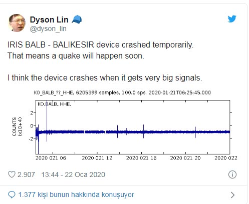 Tayvanlı bilim insanının sosyal medyayı karıştıran mesajında ise IRIS sistemi dahilinde Balıkesir’de bulunan cihazın artan titreşimler sonucu ‘geçici olarak çöktüğü, bunun da yakın zamanda gerçekleşecek bir depremin habercisi olduğu’ iddia ediliyordu. Manisa depreminden yaklaşık dokuz saat önce atılan mesajda, “Cihazın çok büyük sinyaller aldığında çöktüğüne inanıyorum” deniliyordu.
