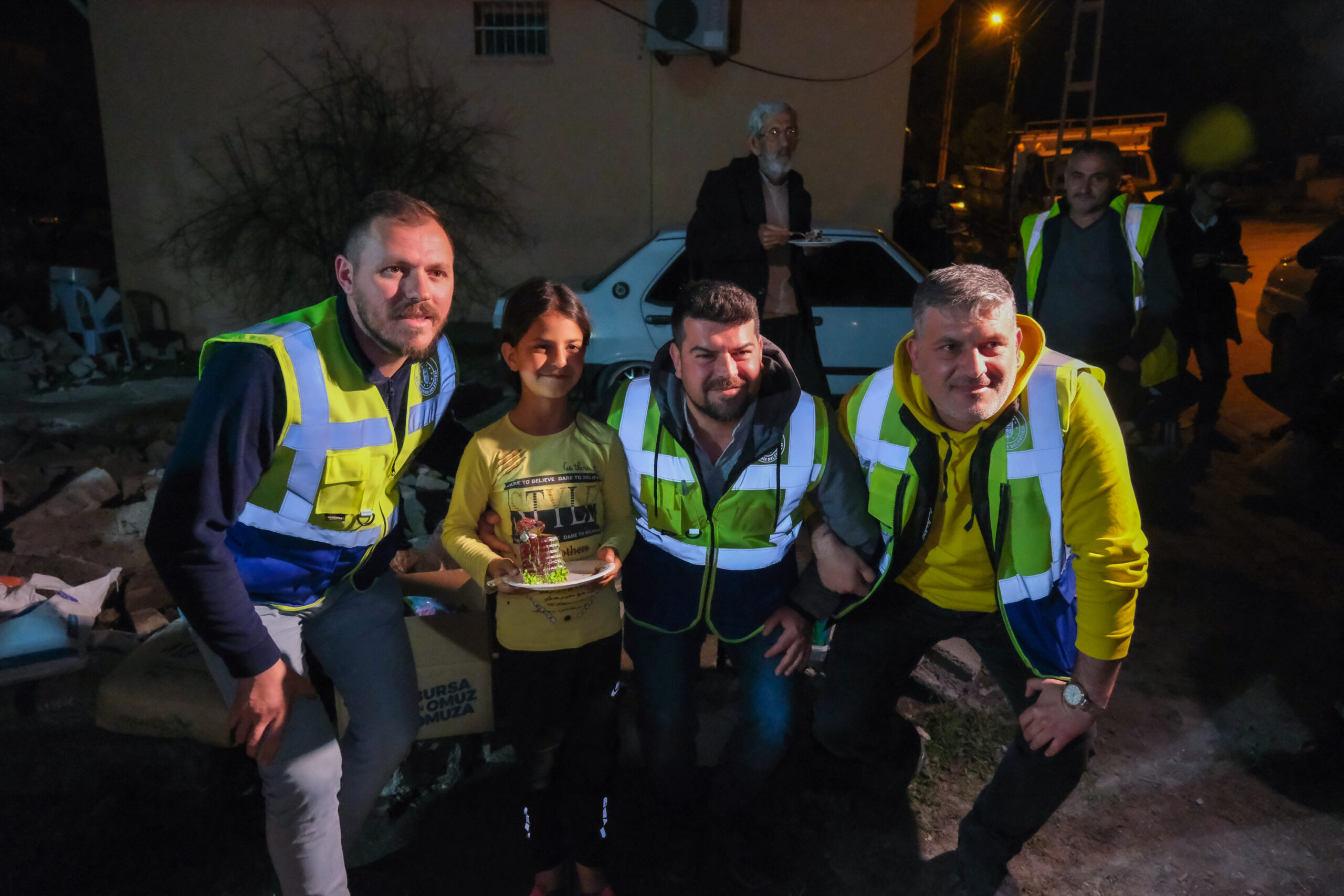 Bursa Büyükşehir Belediyesi’nin Hatay’daki Koordinasyon Merkezi’ne dönen ekipler, küçük Zehra’nın ailesi için erzak, su, giyecek, hijyen malzemesi ve yakacak gibi temel ihtiyaçları araçlara yükledikten sonra bir de doğum günü pastası hazırlayıp, gece vakti Zehra’nın çadırına geldi.