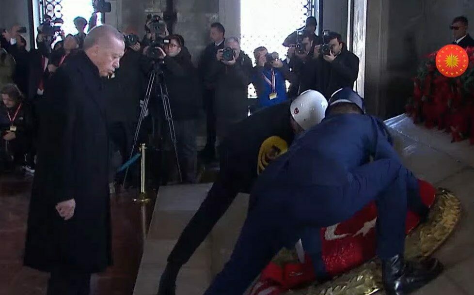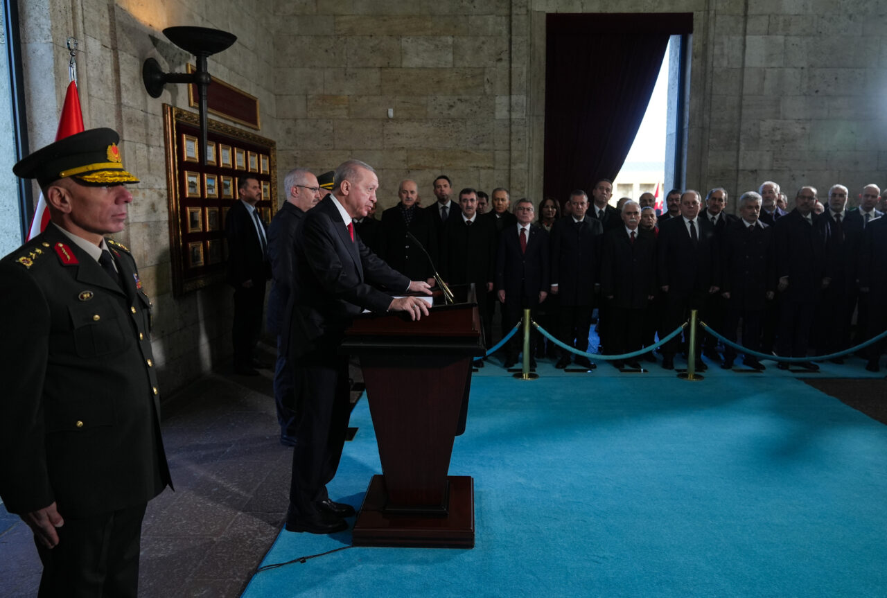 Saygı duruşu sırasında gönderdeki Türk bayrağı yarıya indirildi. Cumhurbaşkanı Erdoğan ve protokolde yer alan devlet erkanı, daha sonra Misak-ı Milli Kulesi’ne geçti. Erdoğan burada Anıtkabir Özel Defteri’ni imzaladı.
