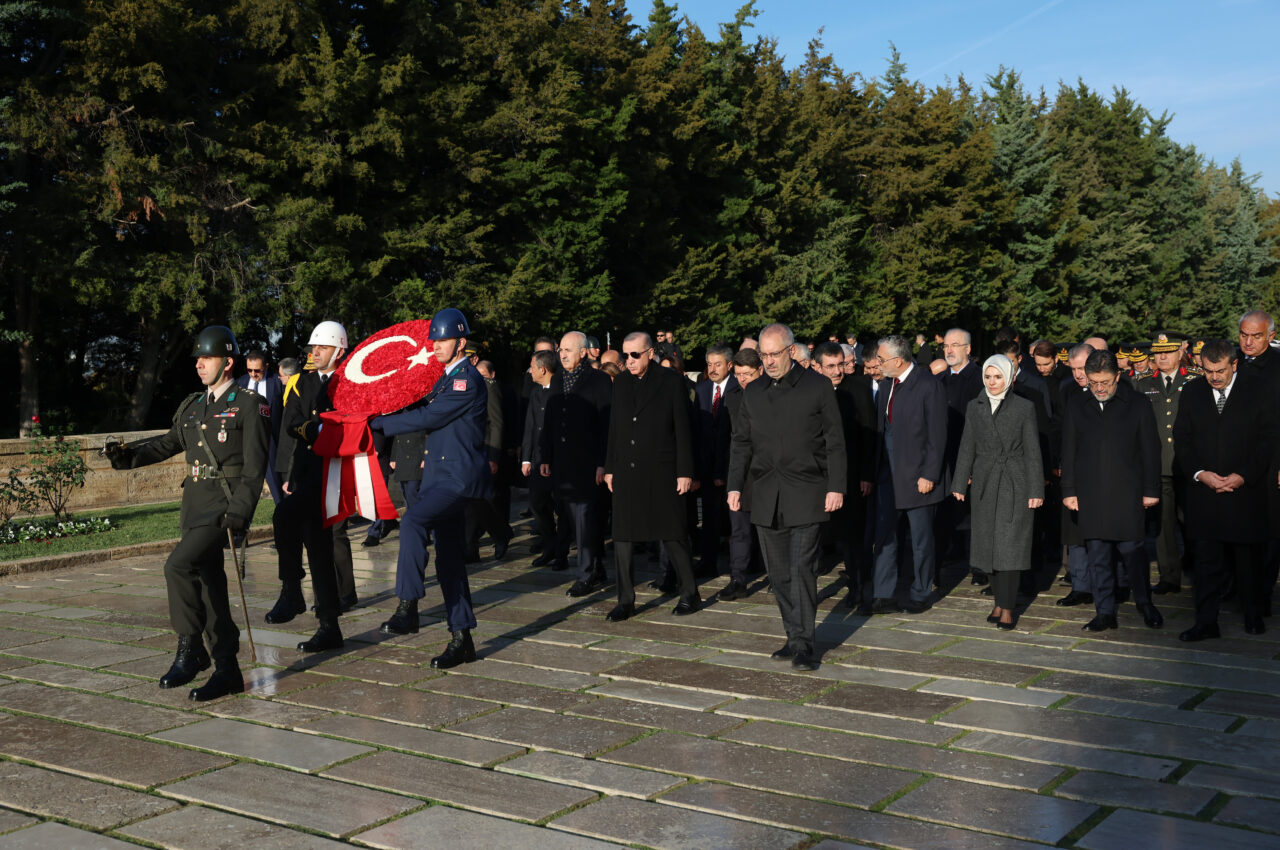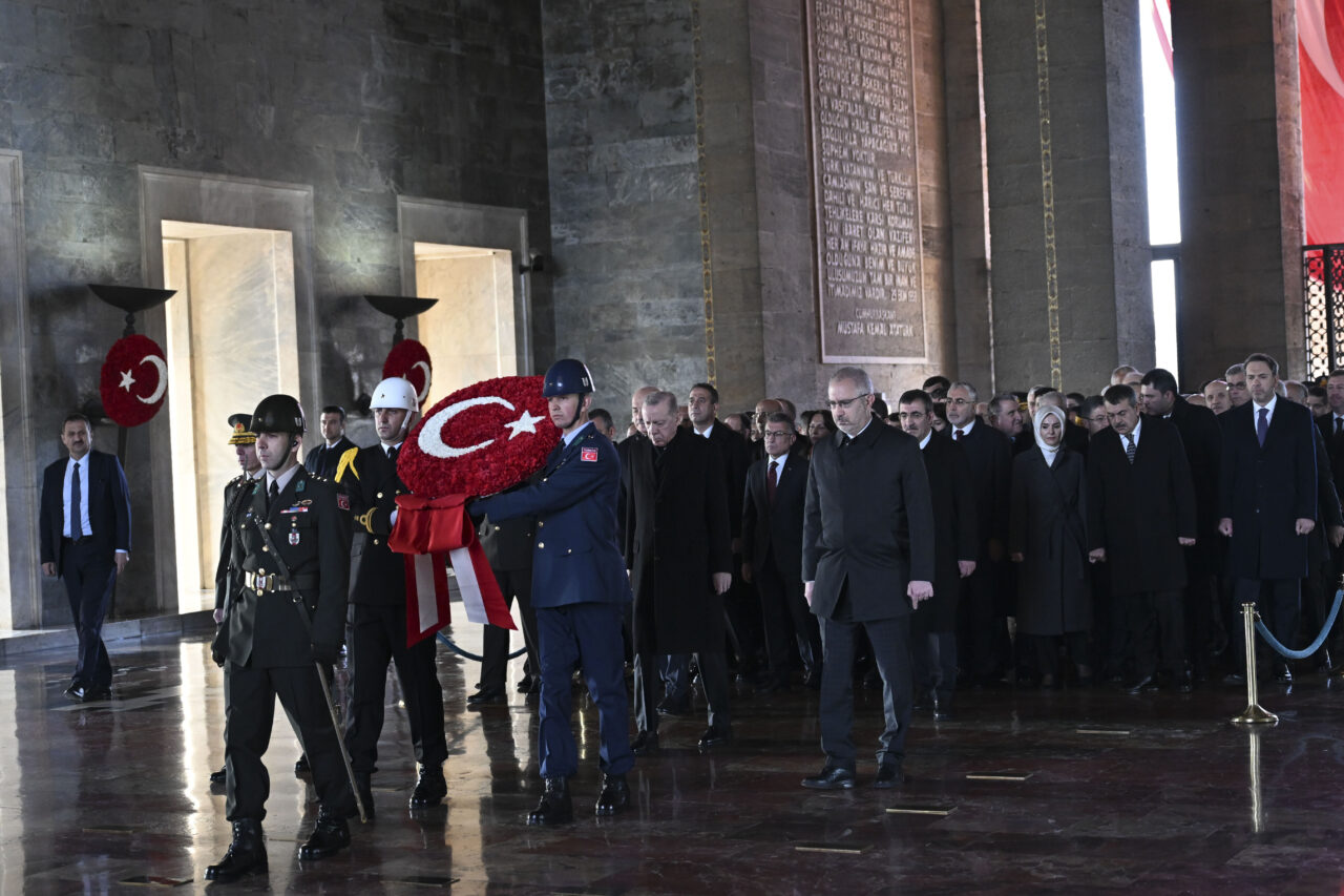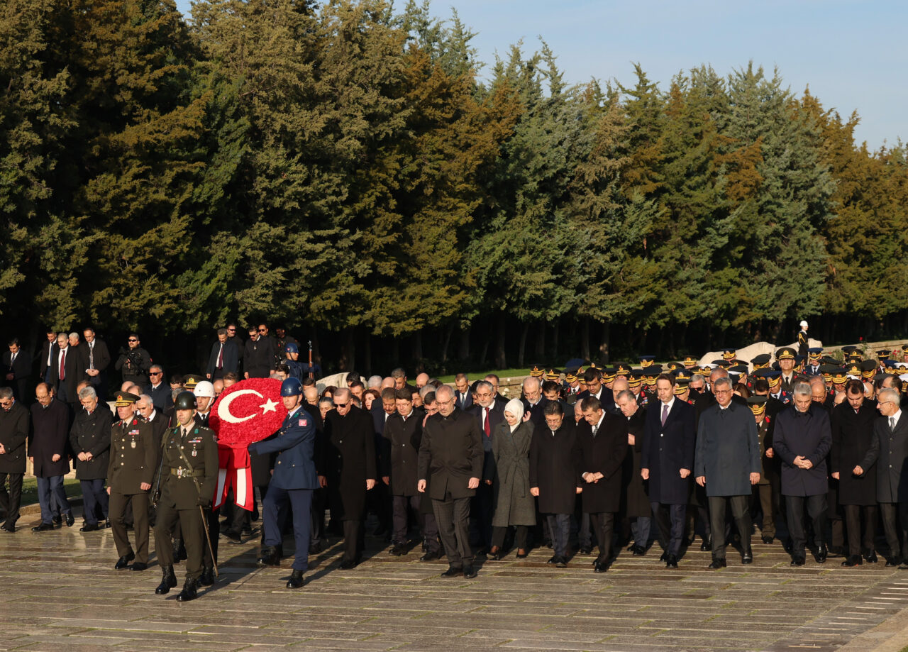 Anıtkabir’deki tören, saat 08.45’te devlet erkanının Aslanlı Yol’dan yürüyüşüyle başladı. Cumhurbaşkanı Erdoğan, kırmızı beyaz karanfillerden oluşan ay yıldızlı çelengi, Atatürk’ün mozolesine bıraktı. Atatürk’ün 86 yıl önce yaşama gözlerini yumduğu saat olan 09.05’te saygı duruşunda bulunuldu ve ardından İstiklal Marşı okundu.
