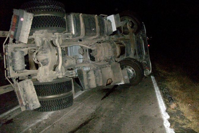 Tekirdağ’ın Malkara ilçesinde yol ortasına devrilen TIR, Malkara-Hayrabolu yolunu trafiğe kapattı.